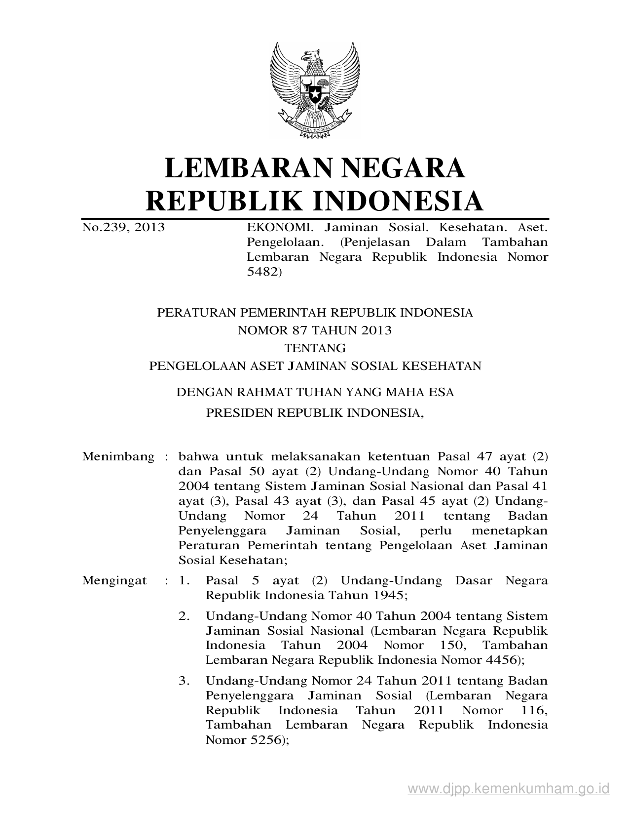 PP Nomor 87 Tahun 2013 | Peraturan Pemerintah Nomor 87 Tahun 2013 tentang PENGELOLAAN ASET JAMINAN SOSIAL KESEHATAN