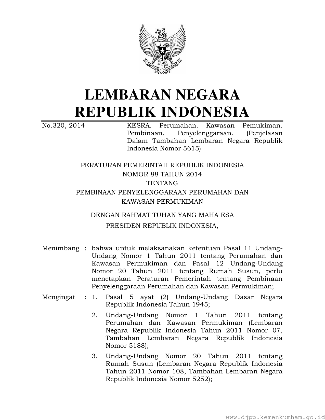 PP Nomor 88 Tahun 2014 | Peraturan Pemerintah Nomor 88 Tahun 2014 tentang PEMBINAAN PENYELENGGARAAN PERUMAHAN DAN KAWASAN PEMUKIMAN