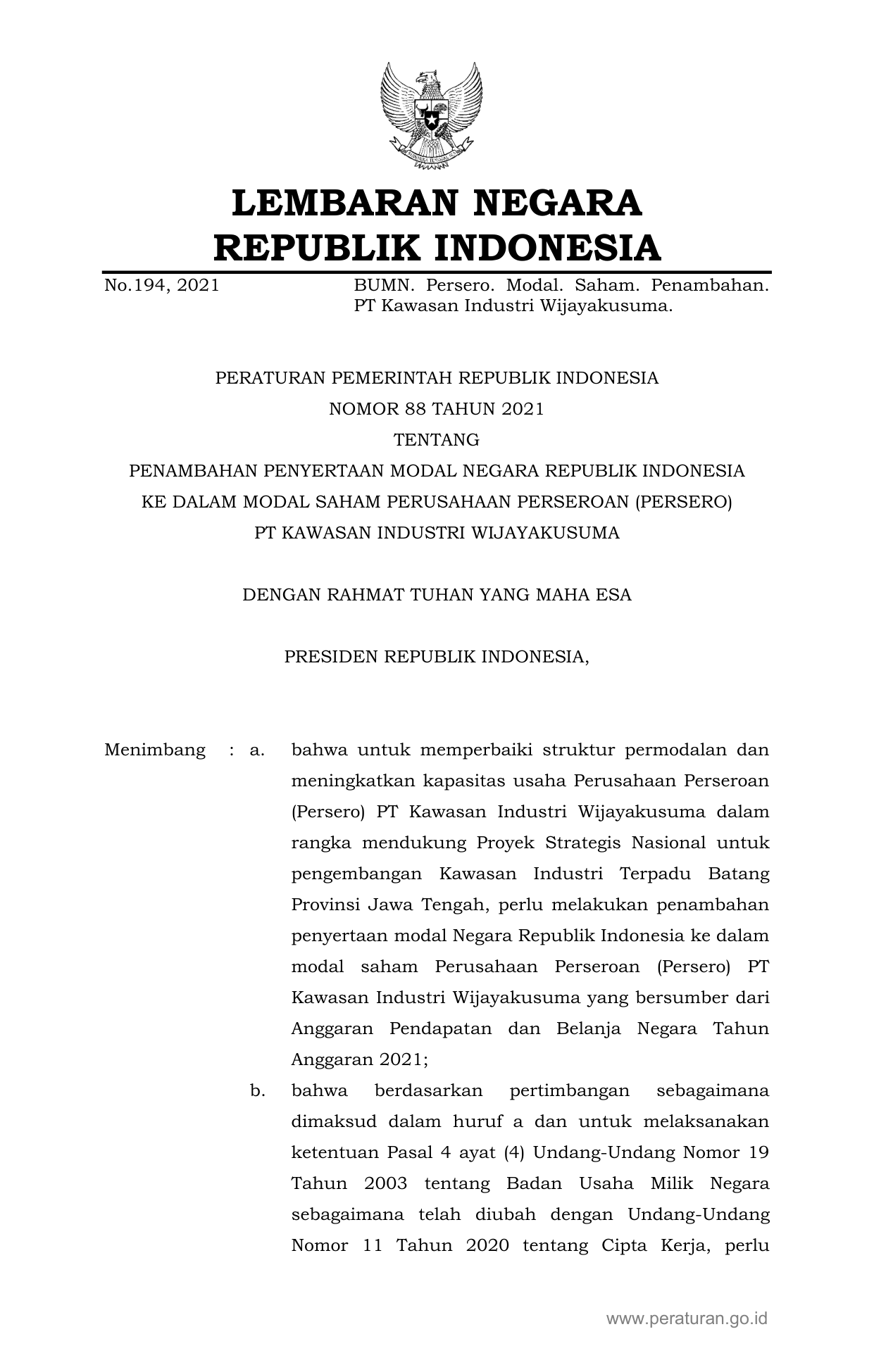 PP Nomor 88 Tahun 2021 | Peraturan Pemerintah Nomor 88 Tahun 2021 tentang PENAMBAHAN PENYERTAAN MODAL NEGARA REPUBLIK INDONESIA KE DALAM MODAL SAHAM PERUSAHAAN PERSEROAN (PERSERO) PT KAWASAN INDUSTRI WIJAYAKUSUMA