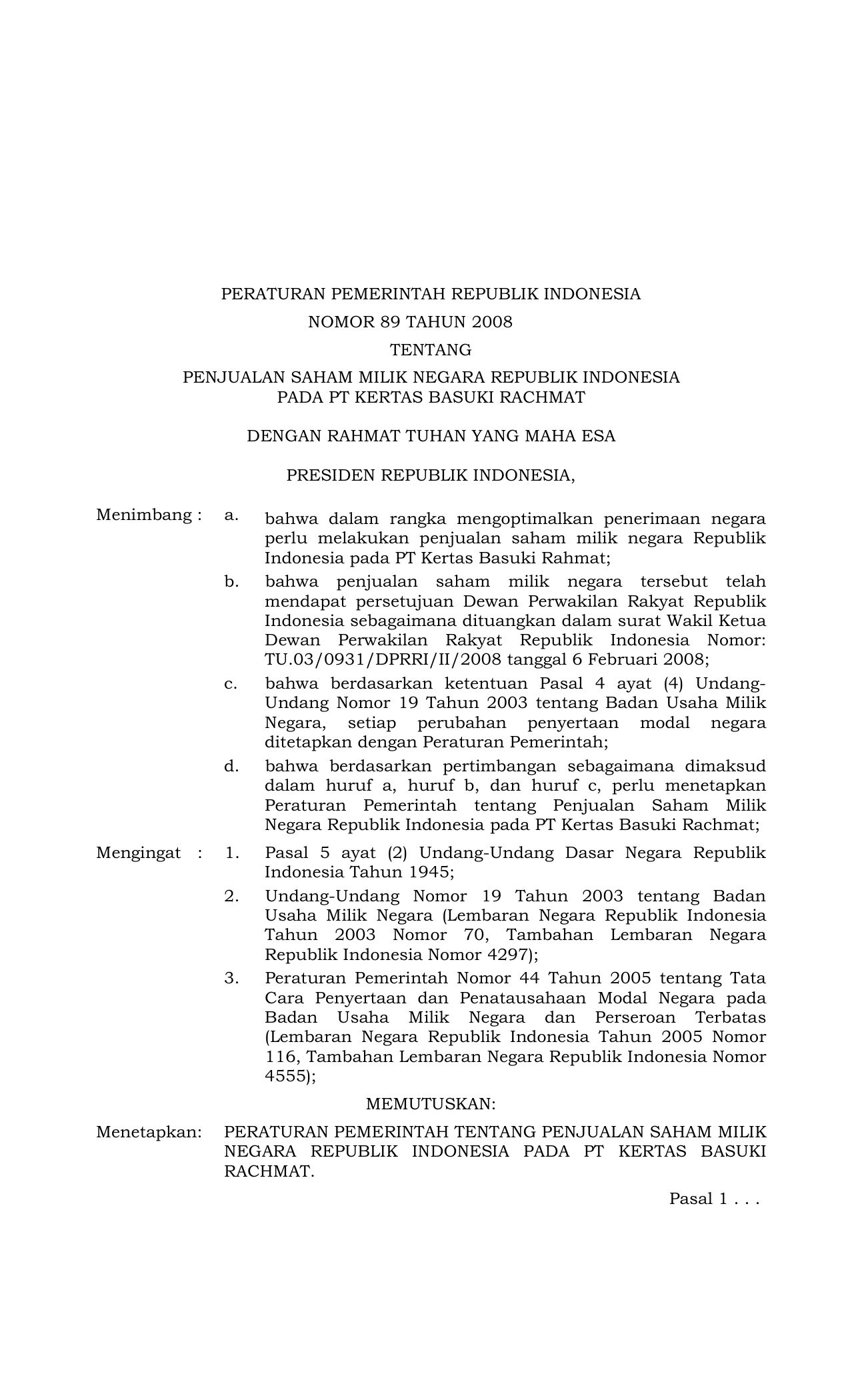 PP Nomor 89 Tahun 2008 | Peraturan Pemerintah Nomor 89 Tahun 2008 tentang PENJUALAN SAHAM MILIK NEGARA RI PADA PT KERTAS BASUKI RAHMAT