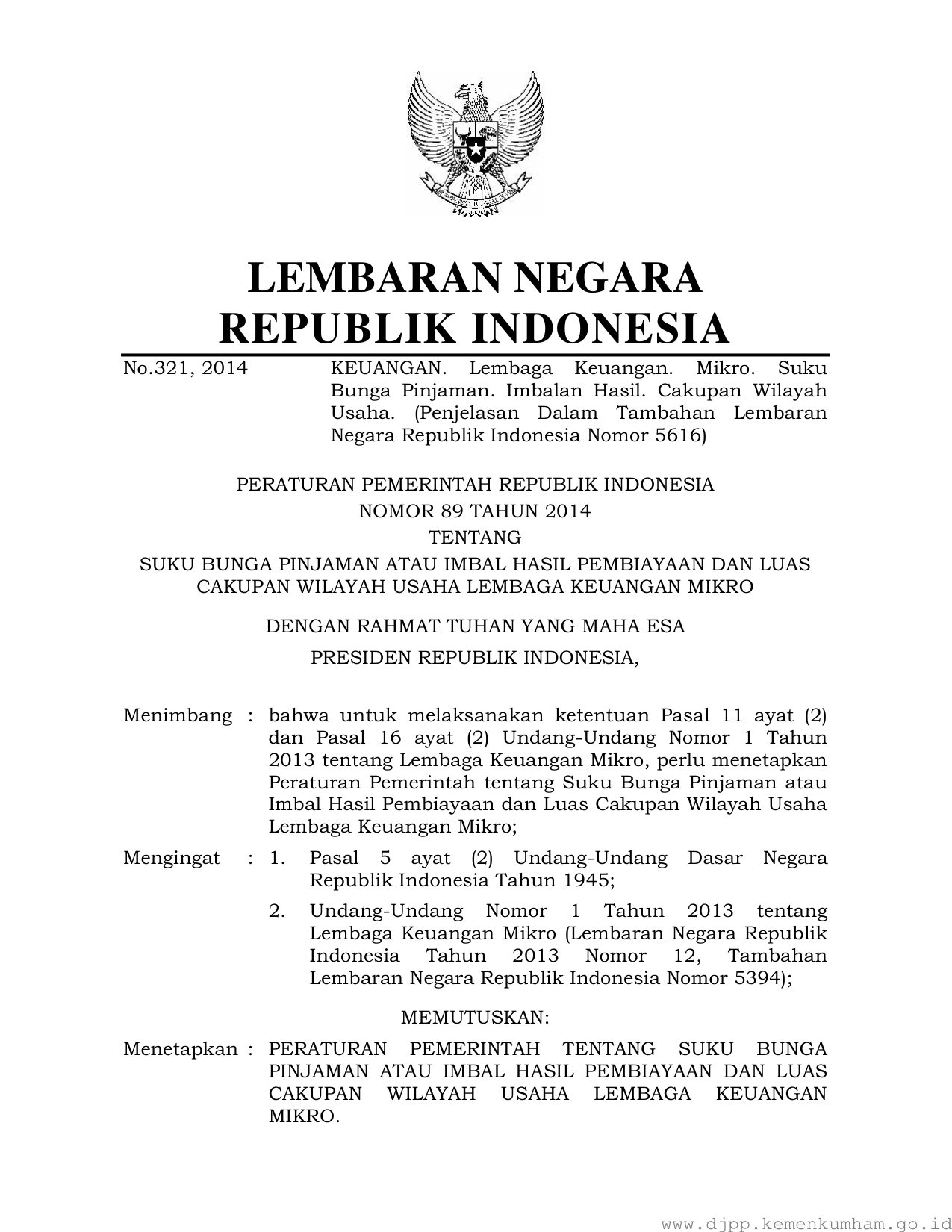 PP Nomor 89 Tahun 2014 | Peraturan Pemerintah Nomor 89 Tahun 2014 tentang SUKU BUNGA PINJAMAN ATAU IMBAL HASIL PEMBIAYAAN DAN LUAS CAKUPAN WILAYAH USAHA LEMBAGA KEUANGAN MIKRO