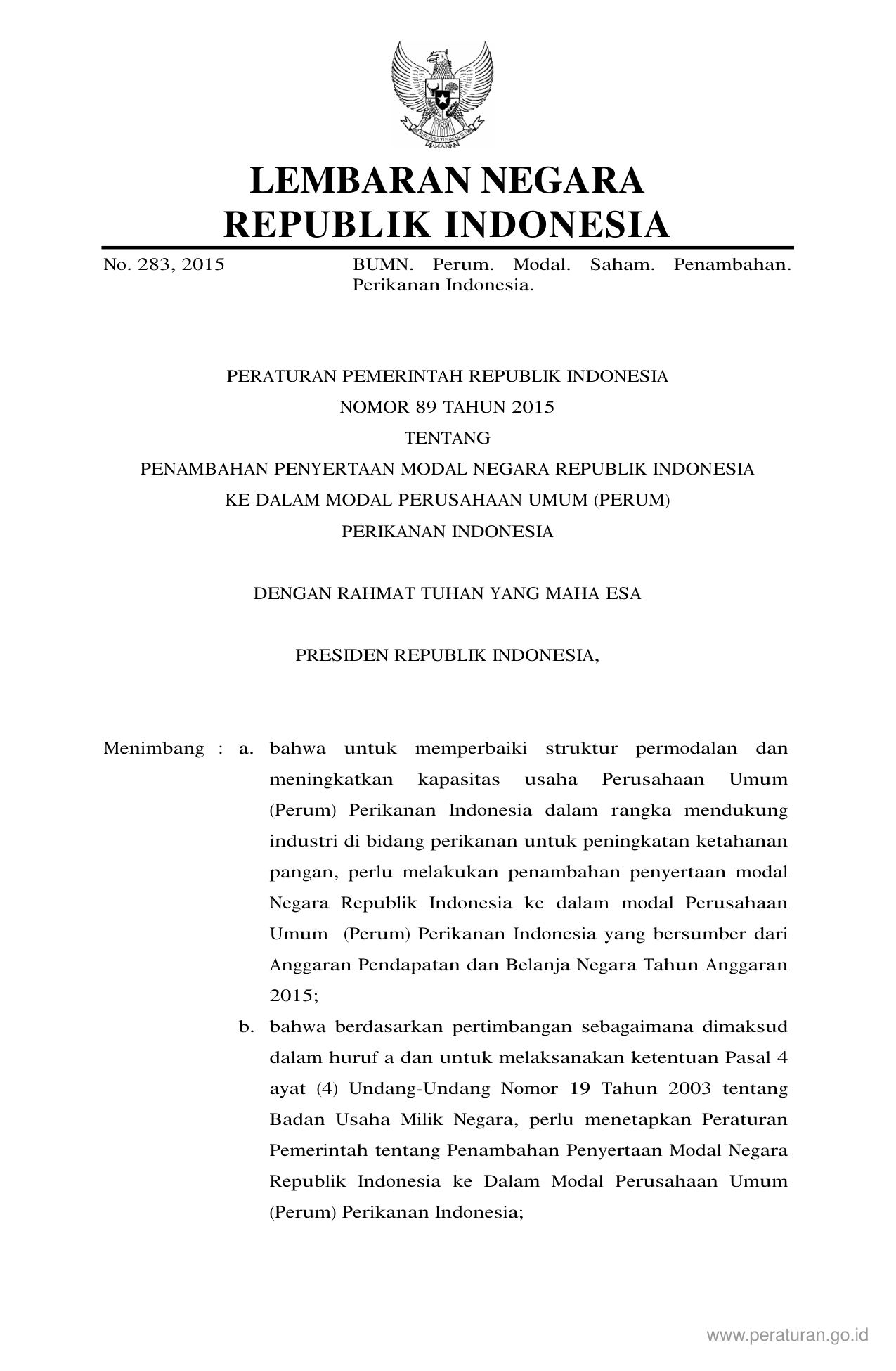 PP Nomor 89 Tahun 2015 | Peraturan Pemerintah Nomor 89 Tahun 2015 tentang PENAMBAHAN PENYERTAAN MODAL NEGARA REPUBLIK INDONESIA KE DALAM MODAL SAHAM PERUSAHAAN PERSEROAN PERSERO PT PERIKANAN INDONESIA