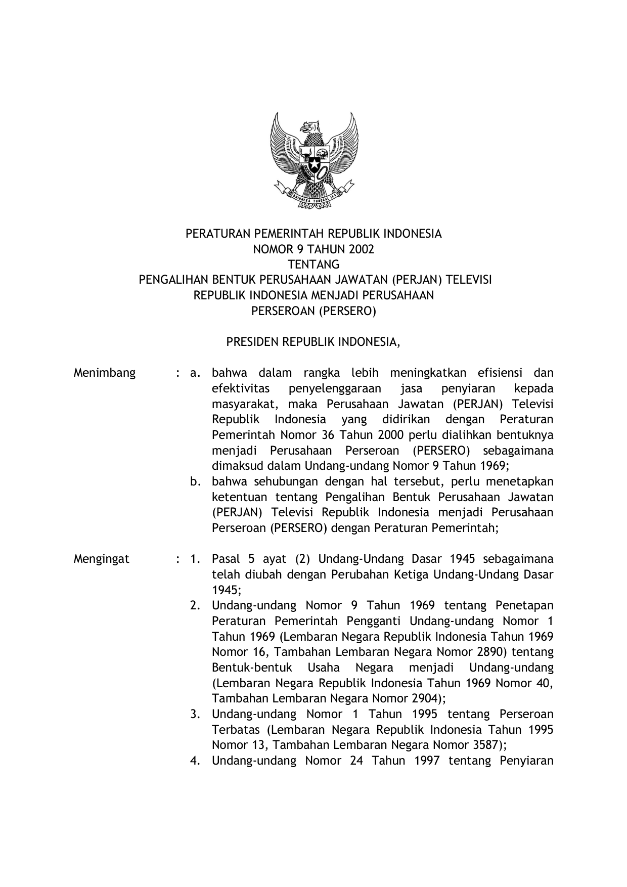 PP Nomor 9 Tahun 2002 | Peraturan Pemerintah Nomor 9 Tahun 2002 tentang PENGALIHAN BANTUK PERUSAHAAN JAWATAN (PERJAN) TVRI MENJADI PERUSAHAAN PERSEROAN (PERSERO)
