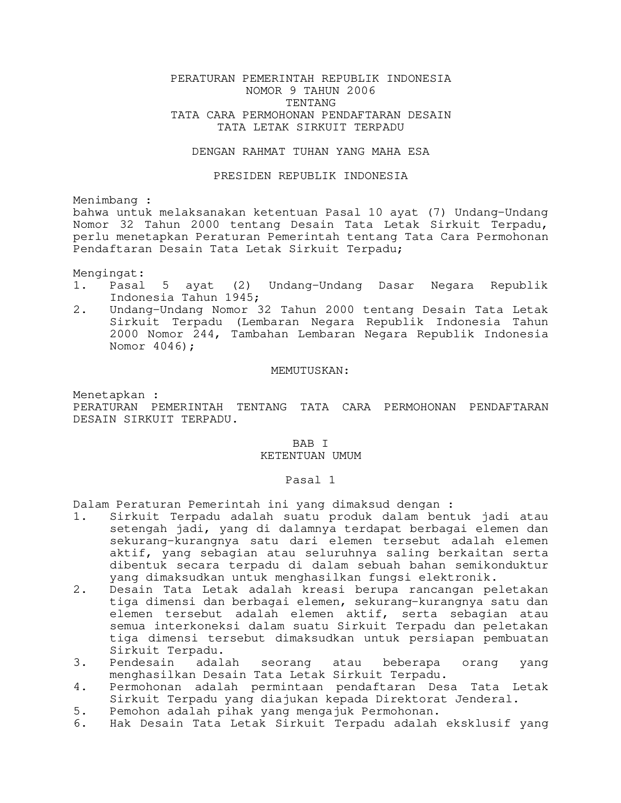 PP Nomor 9 Tahun 2006 | Peraturan Pemerintah Nomor 9 Tahun 2006 tentang TATA CARA PERMOHONAN PENDAFTARAN DESAIN TATA LETAK SIRKUIT TERPADU