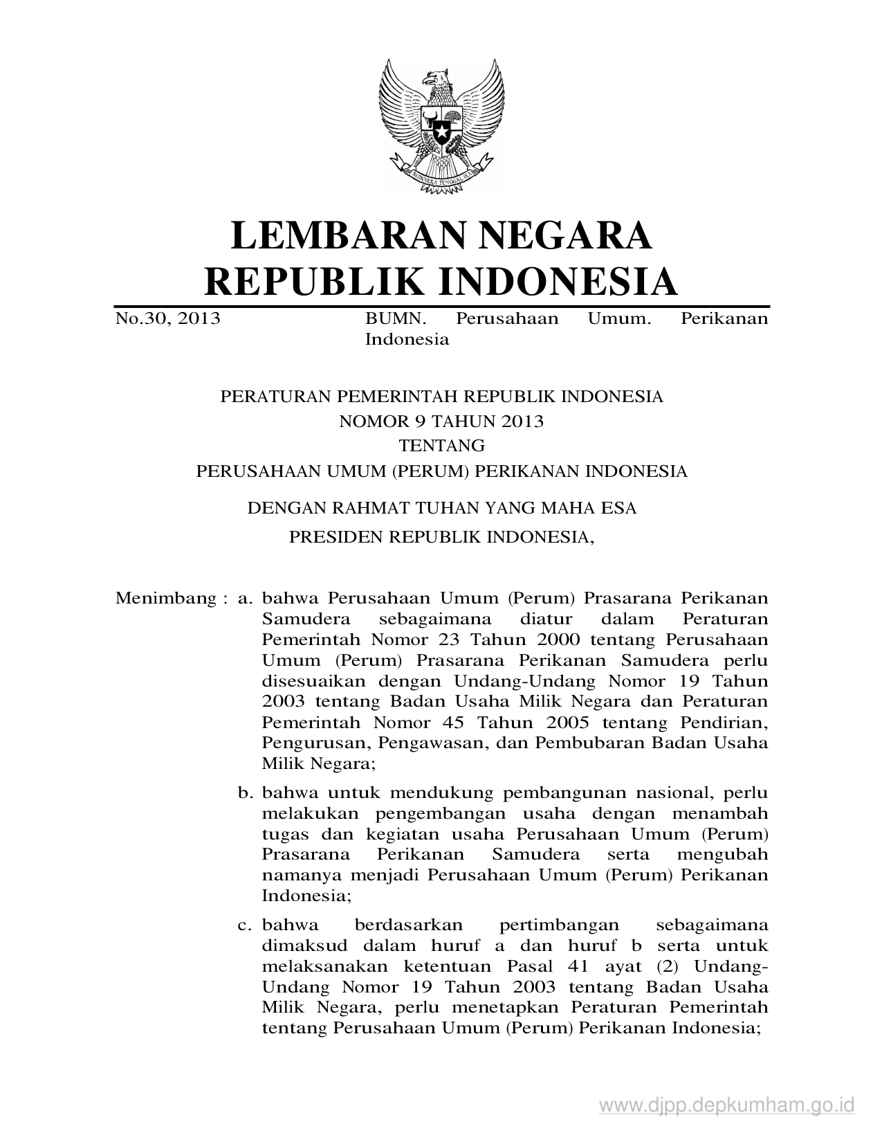 PP Nomor 9 Tahun 2013 | Peraturan Pemerintah Nomor 9 Tahun 2013 tentang PERUSAHAAN UMUM (PERUM) PERIKANAN INDONESIA