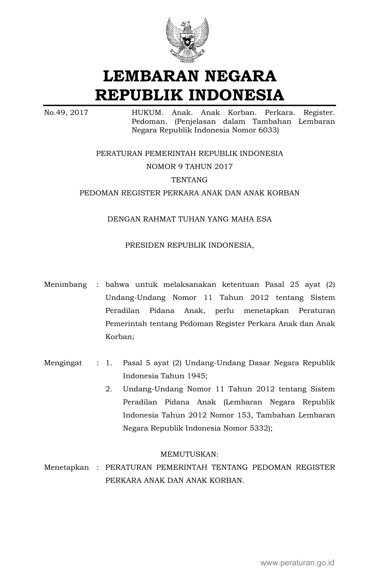 PP Nomor 9 Tahun 2017 | Peraturan Pemerintah Nomor 9 Tahun 2017 tentang Pedoman Register Perkara Anak Dan Anak Korban
