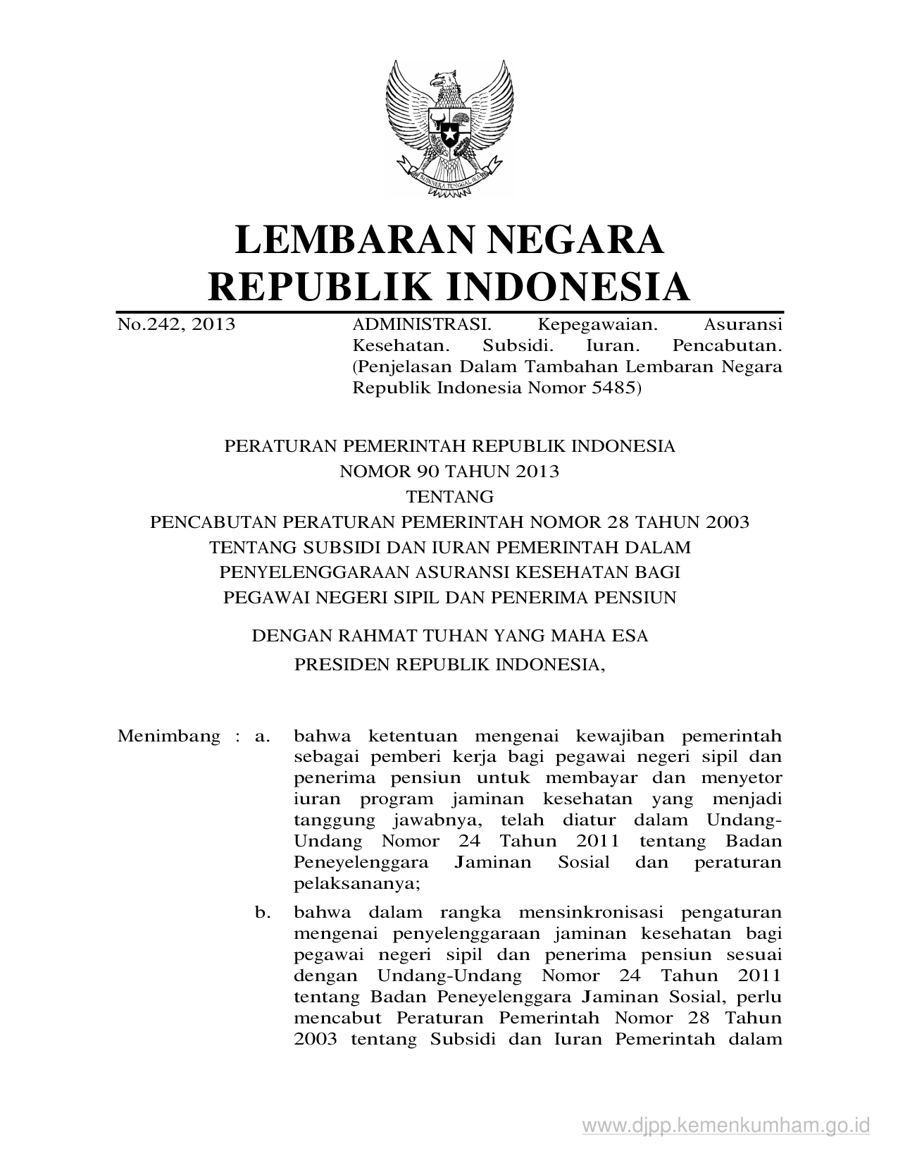 PP Nomor 90 Tahun 2013 | Peraturan Pemerintah Nomor 90 Tahun 2013 tentang PENCABUTAN PERATURAN PEMERINTAH NOMOR 28 TAHUN 2003 TENTANG SUBSIDI DAN IURAN PEMERINTAH DALAM PENYELENGGARAAN ASURANSI KESEHATAN BAGI PEGAWAI NEGERI SIPIL DAN PENERIMA PENSIUN
