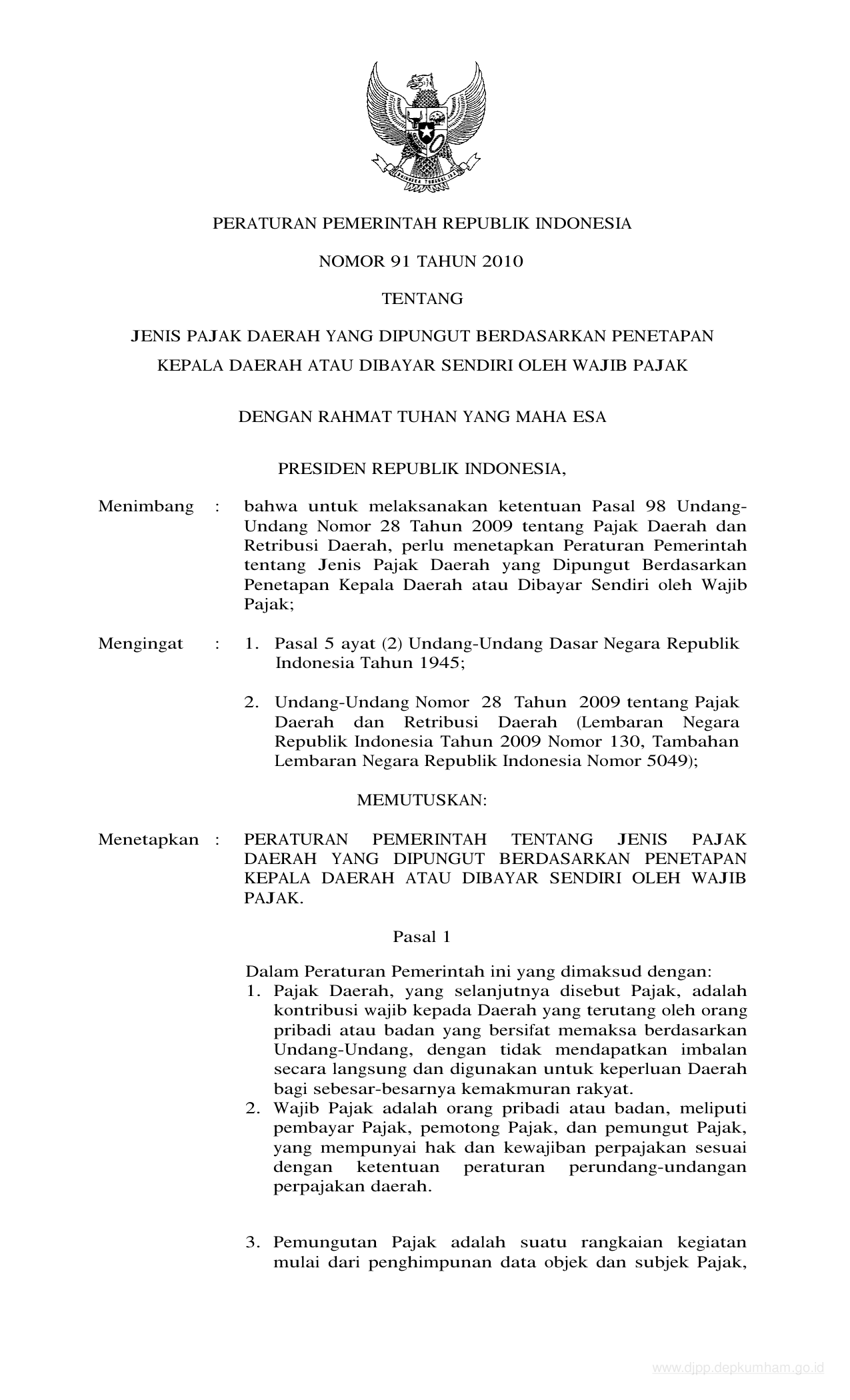 PP Nomor 91 Tahun 2010 | Peraturan Pemerintah Nomor 91 Tahun 2010 tentang JENIS PAJAK DAERAH YANG DIPUNGUT BERDASARKAN PENETAPAN KEPALA DAERAH ATAU DIBAYAR SENDIRI OLEH WAJIB PAJAK