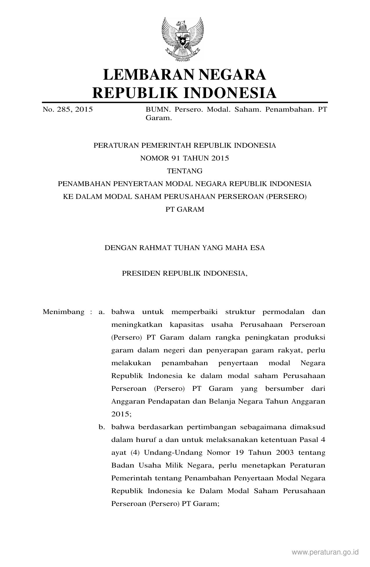 PP Nomor 91 Tahun 2015 | Peraturan Pemerintah Nomor 91 Tahun 2015 tentang PENAMBAHAN PENYERTAAN MODAL NEGARA REPUBLIK INDONESIA KE DALAM MODAL SAHAM PERUSAHAAN PERSEROAN PERSERO PT GARAM