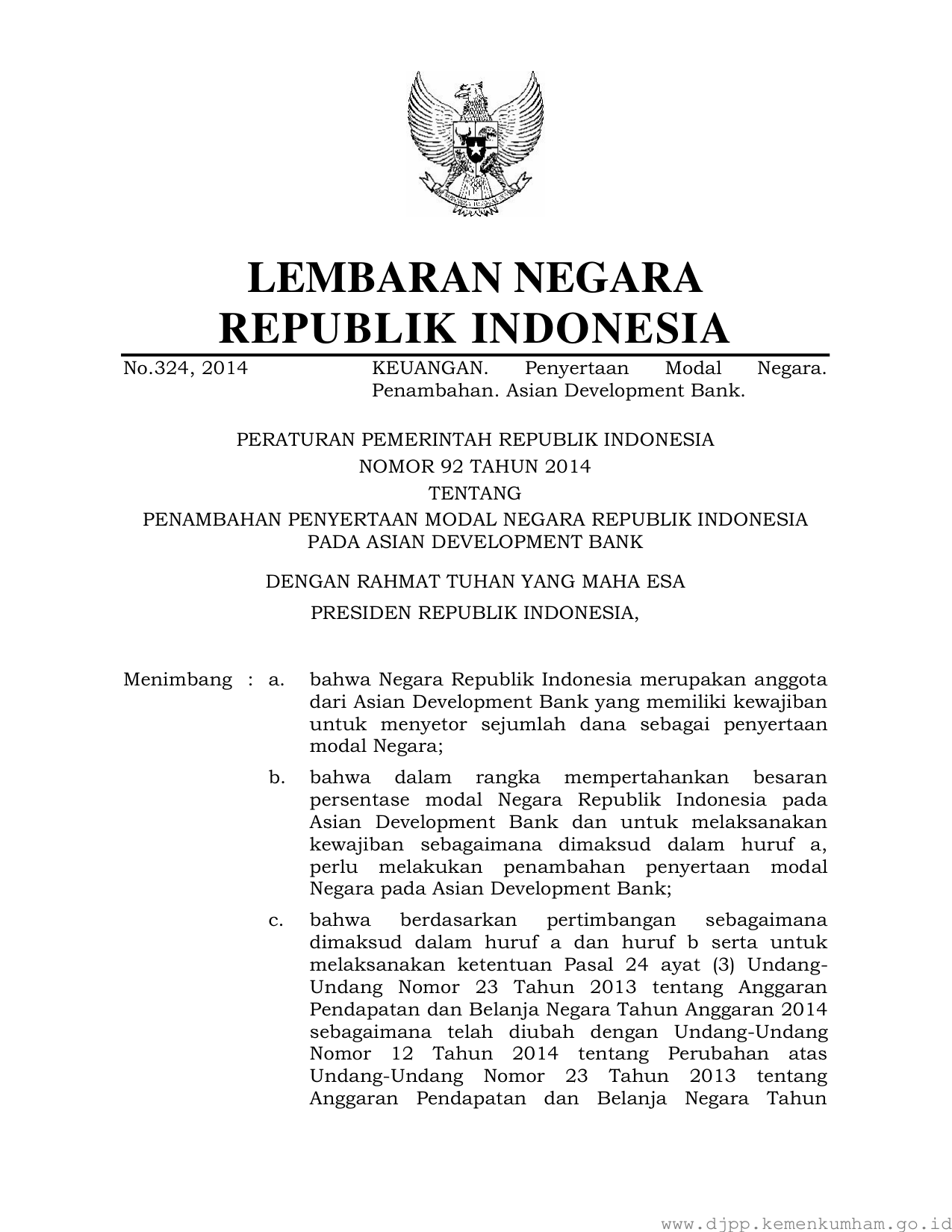 PP Nomor 92 Tahun 2014 | Peraturan Pemerintah Nomor 92 Tahun 2014 tentang PENAMBAHAN PENYERTAAN MODAL NEGARA REPUBLIK INDONESIA PADA ASIAN DEVELOPMENT BANK