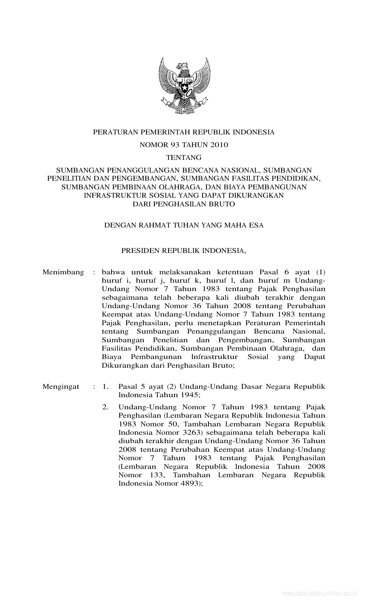PP Nomor 93 Tahun 2010 | Peraturan Pemerintah Nomor 93 Tahun 2010 tentang SUMBANGAN PENANGGULANGAN BENCANA NASIONAL, SUMBANGAN PENELITIAN DAN PENGEMBANGAN, SUMBANGAN FASILITAS PENDIDIKAN, SUMBANGAN PEMBINAAN OLAH RAGA, DAN BIAYA PEMBANGUNAN INFRASTRUKTUR SOSIAL YANG DAPAT DIKURANGKAN DARI PENGHASILAN BRUTO