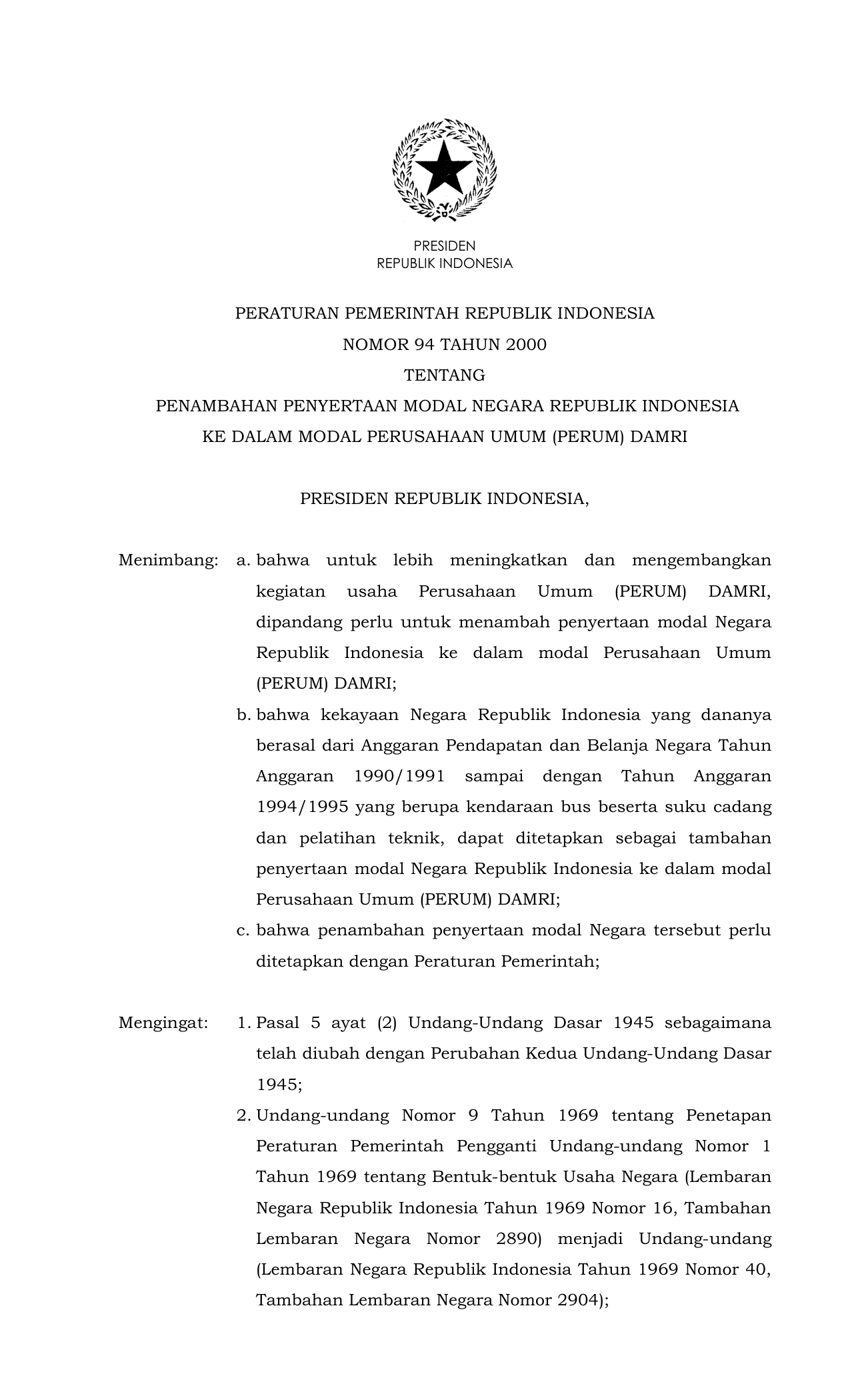 PP Nomor 94 Tahun 2000 | Peraturan Pemerintah Nomor 94 Tahun 2000 tentang PENAMBAHAN PENYERTAAN MODAL NEGARA RI KE DALAM MODAL SAHAM PERUSAHAAN UMUM (PERUM) DAMRI