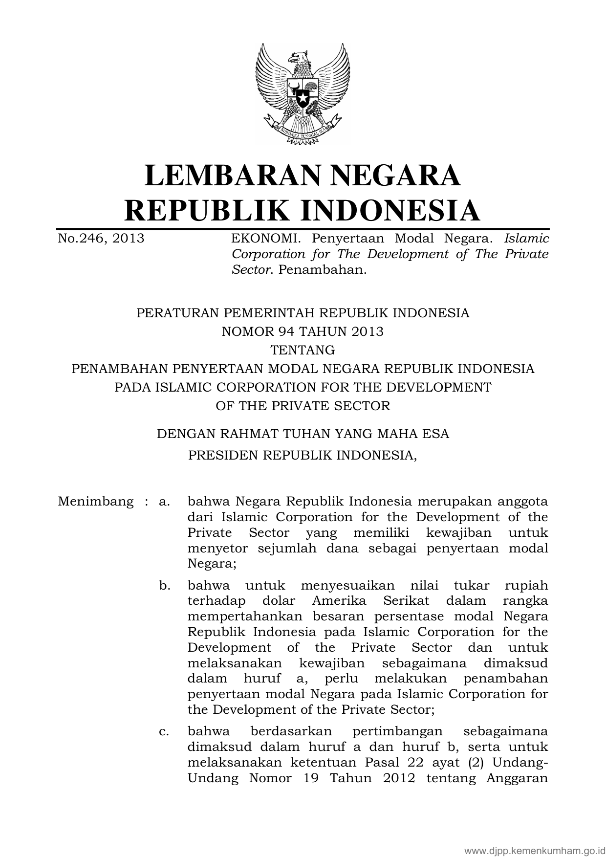 PP Nomor 94 Tahun 2013 | Peraturan Pemerintah Nomor 94 Tahun 2013 tentang PENAMBAHAN PENYERTAAN MODAL NEGARA REPUBLIK INDONESIA PADA ISLAMIC CORPORATION FOR THE DEVELOPMENT OF THE PRIVATE SECTOR