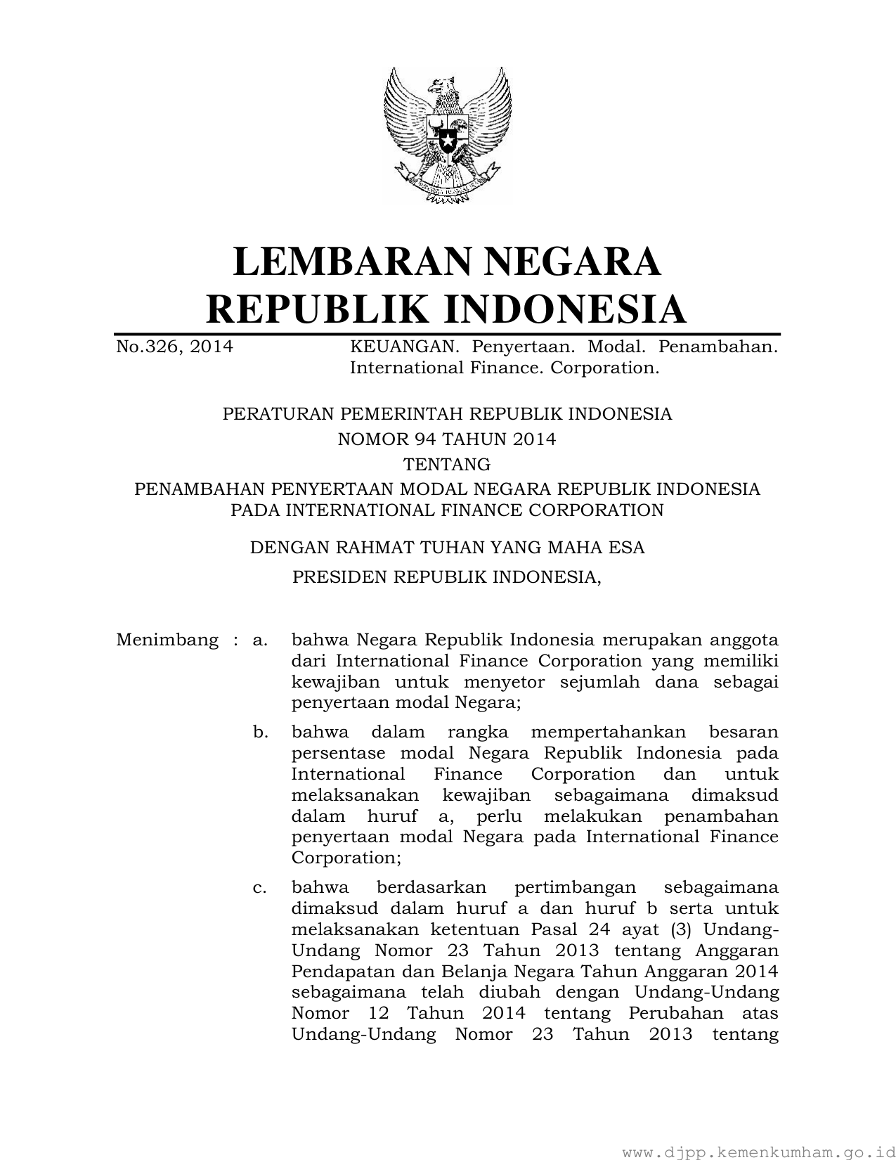PP Nomor 94 Tahun 2014 | Peraturan Pemerintah Nomor 94 Tahun 2014 tentang PENAMBAHAN PENYERTAAN MODAL NEGARA REPUBLIK INDONESIA PADA INTERNATIONAL FINANCE CORPORATION