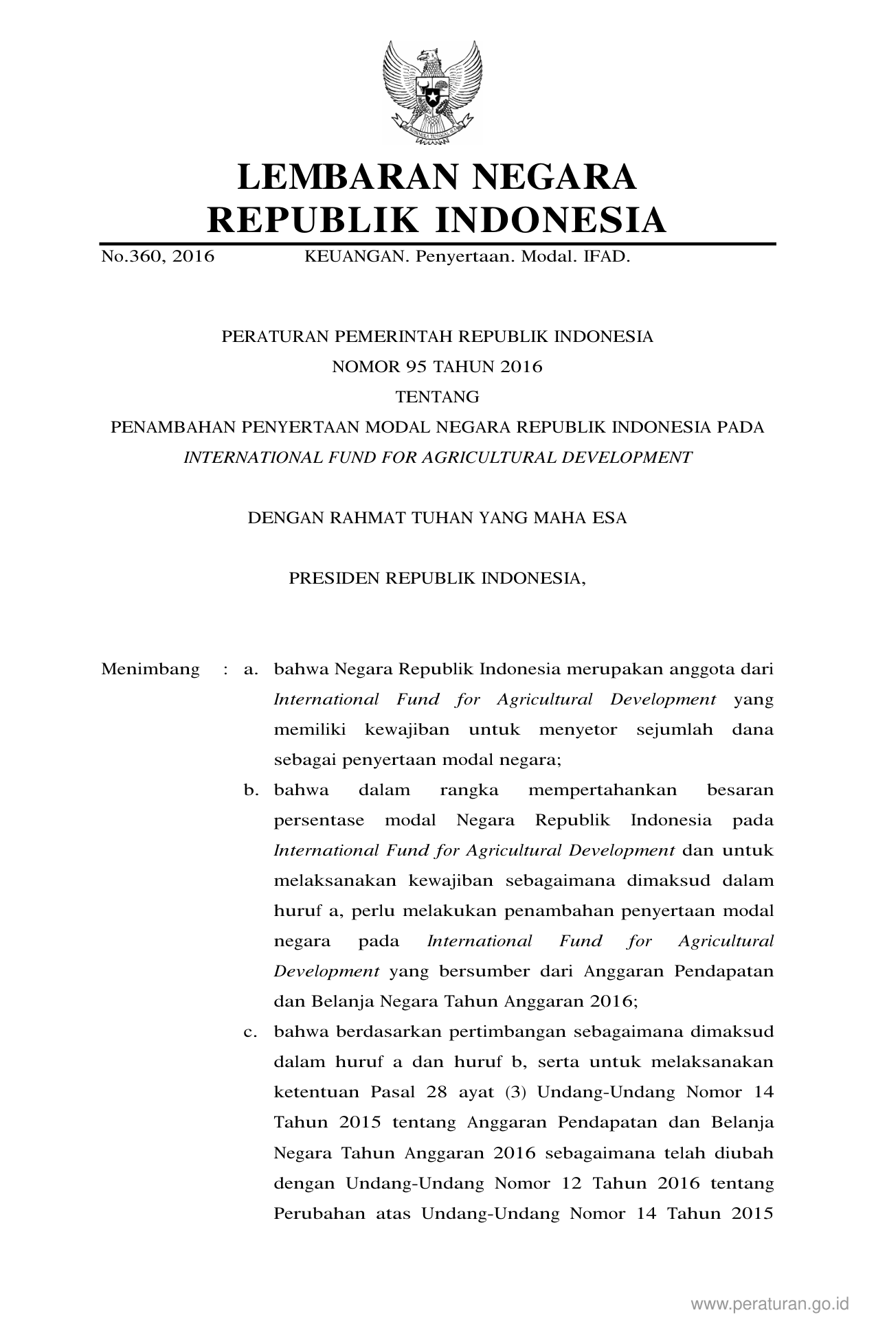 PP Nomor 95 Tahun 2016 | Peraturan Pemerintah Nomor 95 Tahun 2016 tentang Penambahan Penyertaan Modal Negara Republik Indonesia Pada International Fund For Agricultural Development