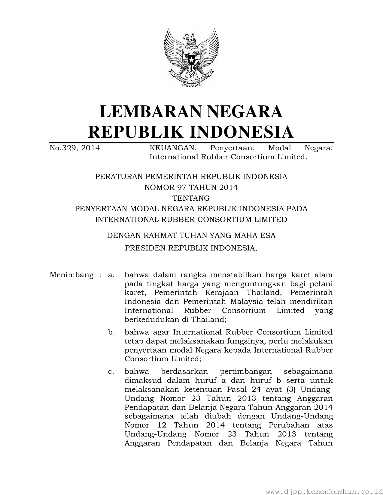 PP Nomor 97 Tahun 2014 | Peraturan Pemerintah Nomor 97 Tahun 2014 tentang PENYERTAAN MODAL NEGARA REPUBLIK INDONESIA PADA INTERNATIONAL RUBBER CONSORTIUM LIMITED