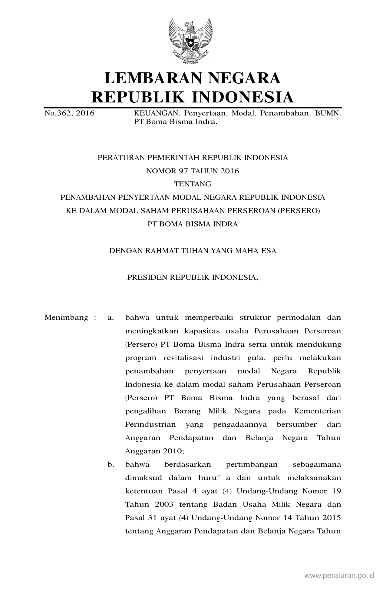 PP Nomor 97 Tahun 2016 | Peraturan Pemerintah Nomor 97 Tahun 2016 tentang Penambahan Penyertaan Modal Negara Republik Indonesia Ke Dalam Modal Saham Perusahaan Perseroan (Persero) PT Boma Bisma Indra
