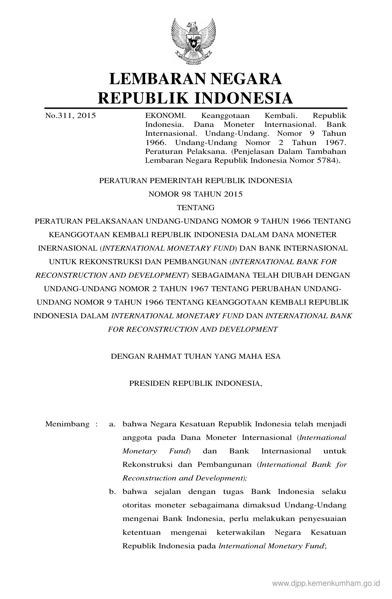 PP Nomor 98 Tahun 2015 | Peraturan Pemerintah Nomor 98 Tahun 2015 tentang PERATURAN PELAKSANA UNDANGUNDANG NOMOR 9 TAHUN 1966 TENTANGKEANGGOTAAN KEMBALI REPUBLIK INDONESIA DALAM DANA MONETER INTERNASIONAL INTERNATIONAL MONETARY FUND DAN BANK INTERNASIONAL UNTUK REKONTRUKSI DAN PEMBANGUNAN INTERNATIONAL BANK FOR RECONSTRUCTION AND DEVELOPMENT SEBAGIAN TELAH DIUBAH DENGAN UNDANGUNDANG NOMOR 2 TAHUN 1967 TENTANG PERUBAHAN UNDANGUNDANG NOMOR 9 TAHUN 1966 TENTANG KEANGGOTAAN KEMBALI REPUBLIK INDONESIA DALAM INTERNATIONAL MONETARY FUND AND INTERNATIONAL BANK FOR RECONSTRUCTION AND DEVELOPMENT