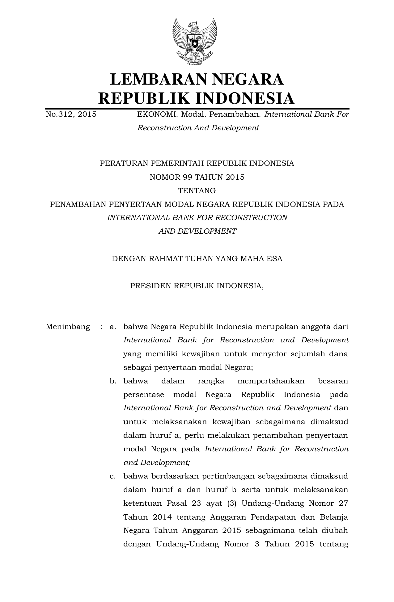 PP Nomor 99 Tahun 2015 | Peraturan Pemerintah Nomor 99 Tahun 2015 tentang PENAMBAHAN PENYERTAAN MODAL NEGARA REPUBLIK INDONESIA PADA INTERNATIONAL BANK FOR RECONSTRUCTION AND DEVELOPMENT