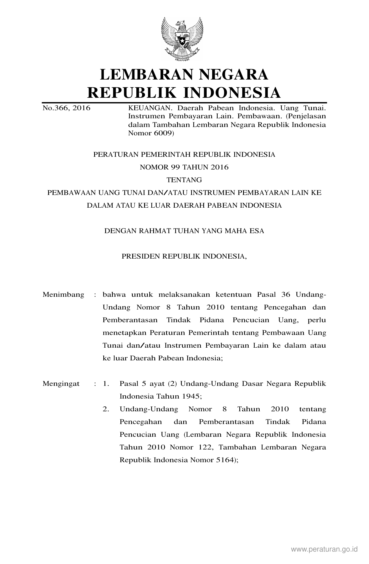 PP Nomor 99 Tahun 2016 | Peraturan Pemerintah Nomor 99 Tahun 2016 tentang Pembawaan Uang Tunai Dan/Atau Instrumen Pembayaran Lain Ke Dalam Atau Ke Luar Daerah Pabean Indonesia