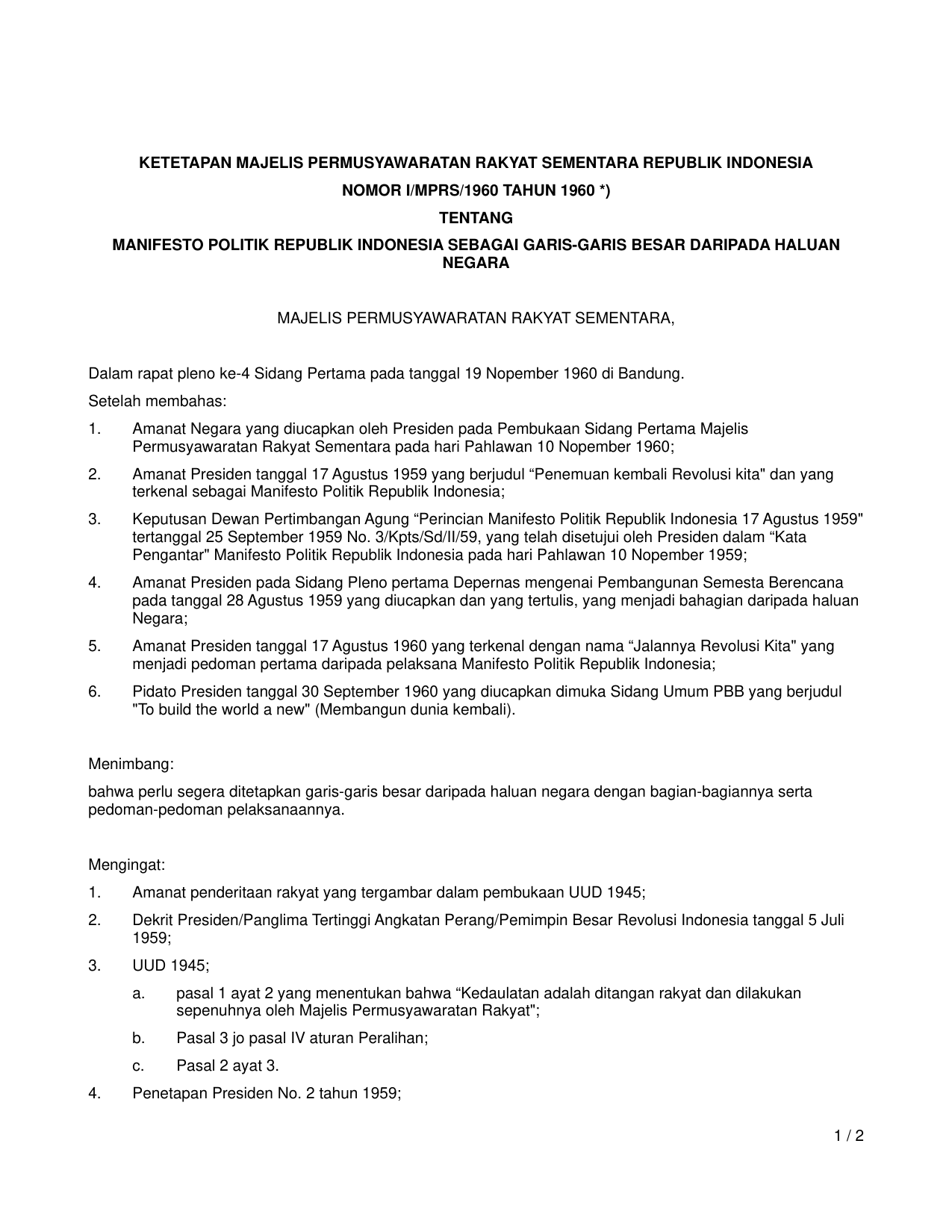 TAP_MPR Nomor i-mprs-1960 Tahun 1960 | Ketetapan Majelis Permusyawaratan Rakyat Nomor i-mprs-1960 Tahun 1960 tentang MANIFESTO POLITIK REPUBLIK INDONESIA SEBAGAI GARIS-GARIS BESAR DARIPADA HALUAN NEGARA