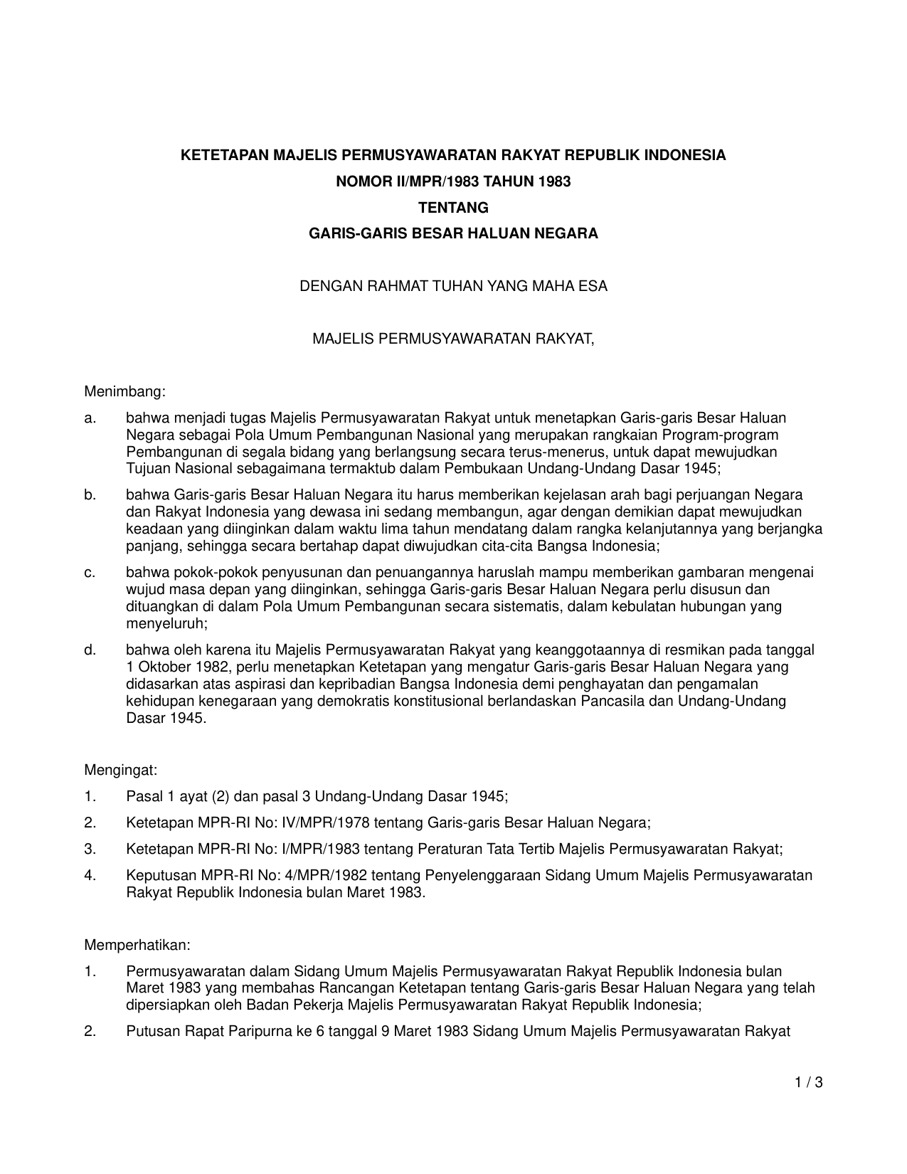 TAP_MPR Nomor ii-mpr-1983 Tahun 1983 | Ketetapan Majelis Permusyawaratan Rakyat Nomor ii-mpr-1983 Tahun 1983 tentang GARIS - GARIS BESAR HALUAN NEGARA