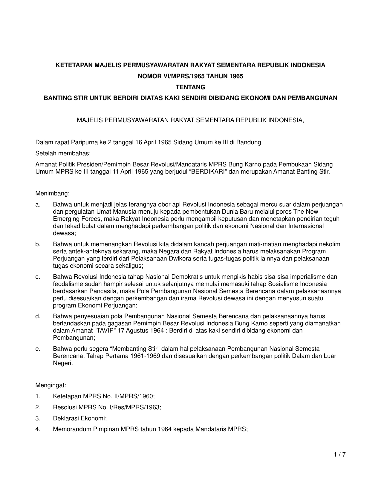 TAP_MPR Nomor v-mprs-1965 Tahun 1965 | Ketetapan Majelis Permusyawaratan Rakyat Nomor v-mprs-1965 Tahun 1965 tentang Banting Stir untuk Berdiri di atas Kaki Sendiri di Bidang Ekonomi dan Pembangunan;