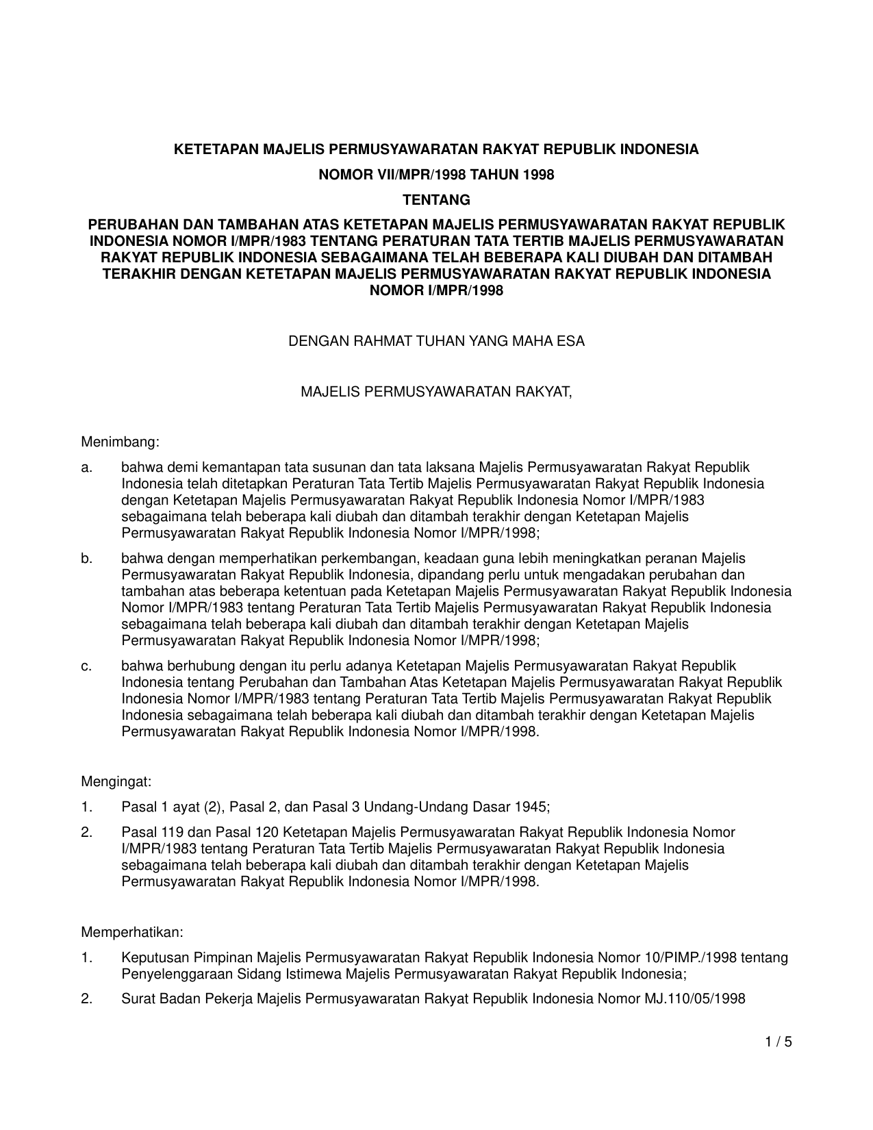 TAP_MPR Nomor vii-mpr-1998 Tahun 1998 | Ketetapan Majelis Permusyawaratan Rakyat Nomor vii-mpr-1998 Tahun 1998 tentang PERUBAHAN DAN TAMBAHAN ATAS KETETAPAN MPR RI NOMOR I/MPR/1983 TENTANG PERATURAN TATA TERTIB MPR RI