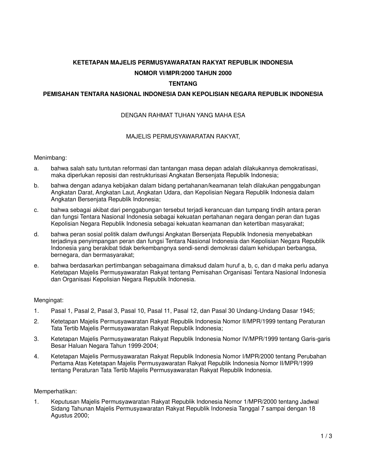 TAP_MPR Nomor vi-mpr-2000 Tahun 2000 | Ketetapan Majelis Permusyawaratan Rakyat Nomor vi-mpr-2000 Tahun 2000 tentang PEMISAHAN TENTARA NASIONAL INDONESIA DAN KEPOLISIAN NEGARA REPUBLIK INDONESIA