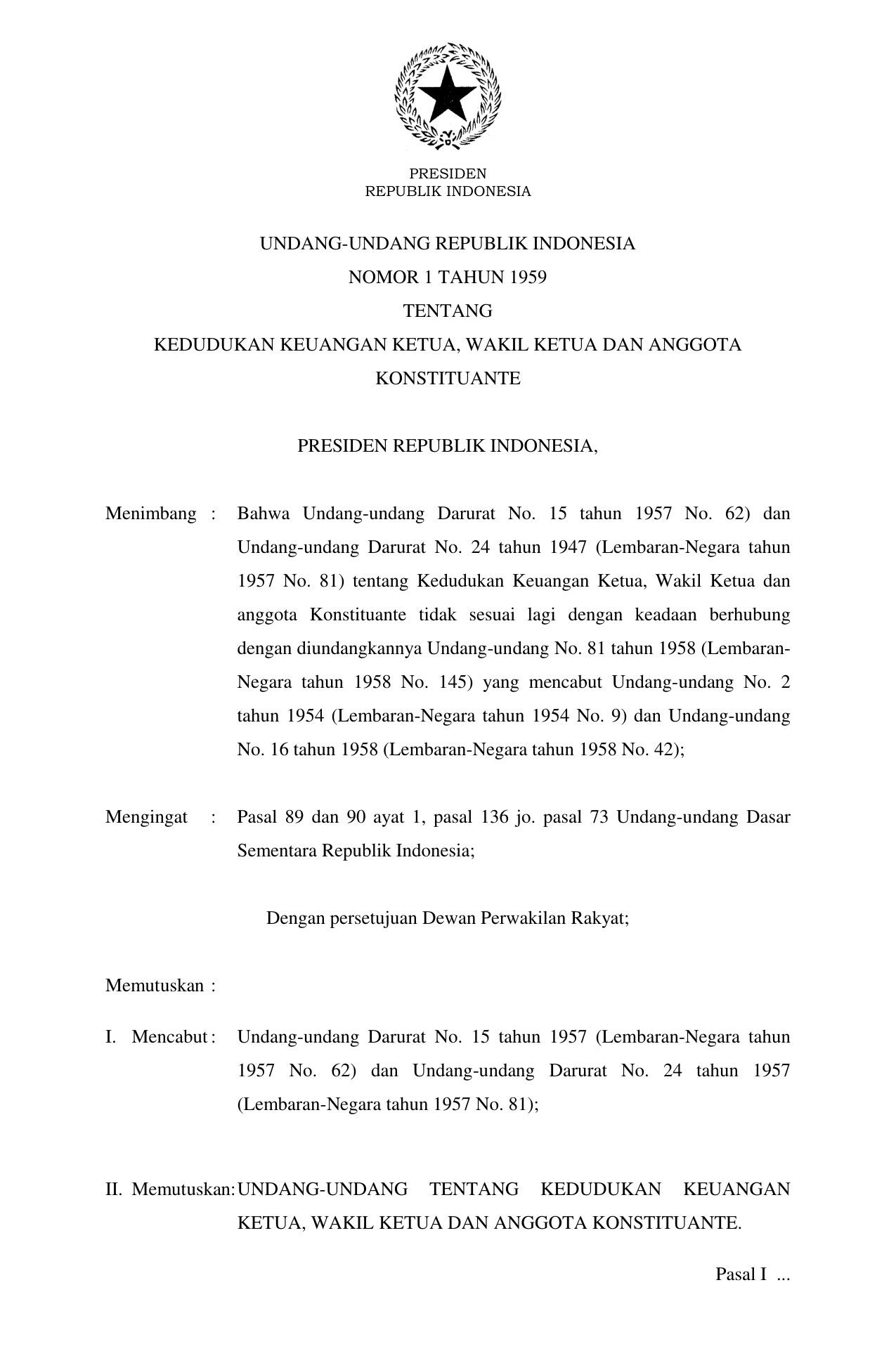 UU Nomor 1 Tahun 1959 | Undang-Undang Nomor 1 Tahun 1959 tentang KEDUDUKAN KEUANGAN KETUA, WAKIL KETUA DAN ANGGOTA KONSTITUANTE
