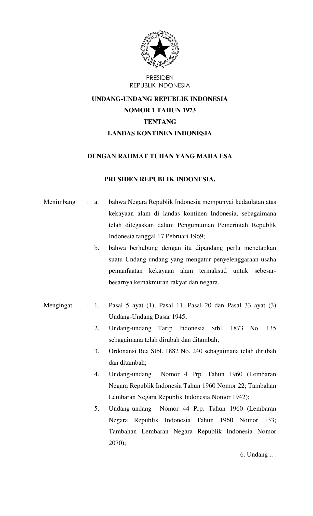 UU Nomor 1 Tahun 1973 | Undang-Undang Nomor 1 Tahun 1973 tentang LANDAS KONTINEN INDONESIA