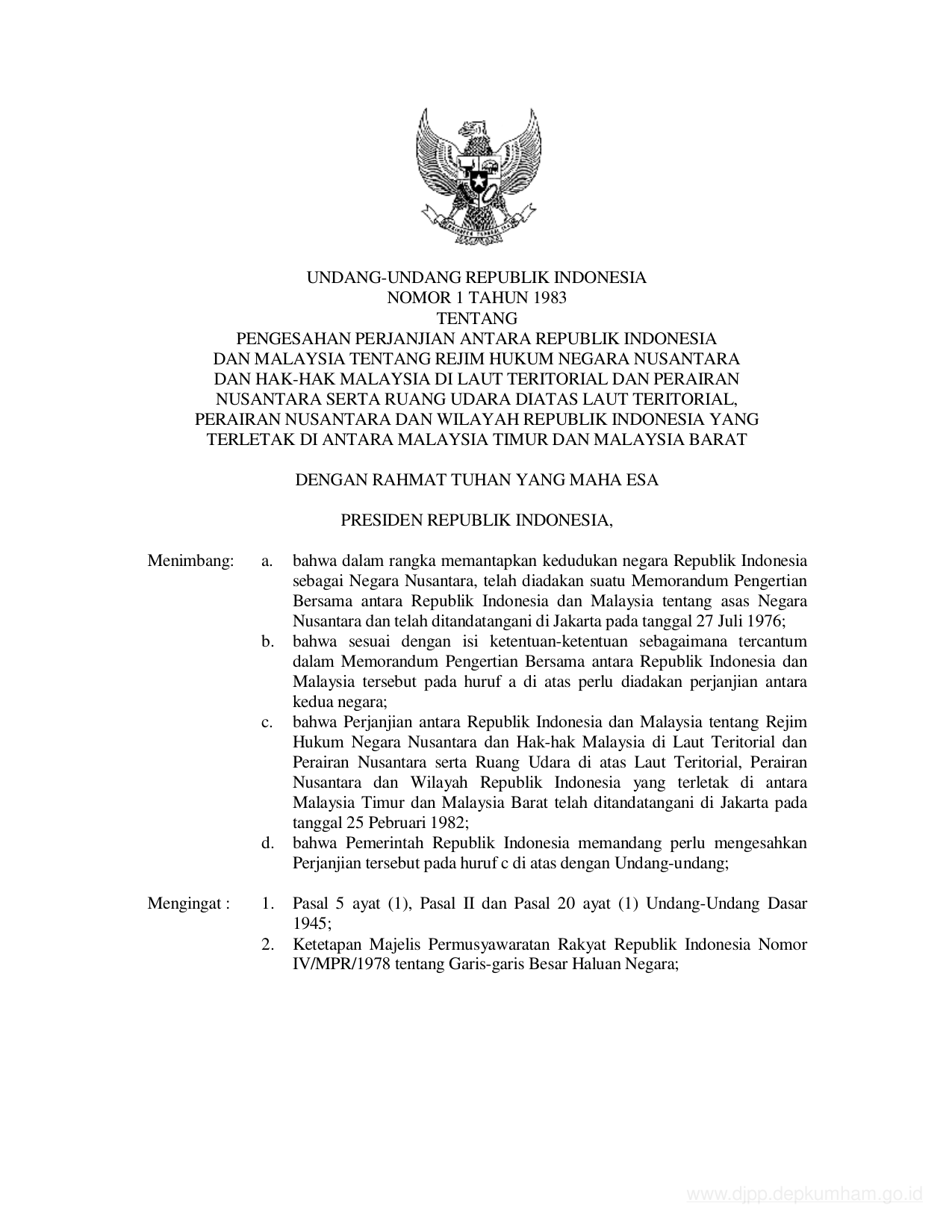 UU Nomor 1 Tahun 1983 | Undang-Undang Nomor 1 Tahun 1983 tentang PENGESAHAN PERJANJIAN ANTARA RI DAN MALAYSIA TENTANG REJIM HUKUM NEGARA NUSANTARA DAN HAK-HAK MALAYSIA DI LAUT TERITORIAL DAN PERAIRAN NUSANTARA SERTA RUANG UDARA DI ATAS LAUT TERITORIAL, PERAIRAN NUSANTARA DAN WILAYAH RI YANG TERLETAK DI ANTARA MALAYSIA TIMUR DAN MALAYSIA BARAT