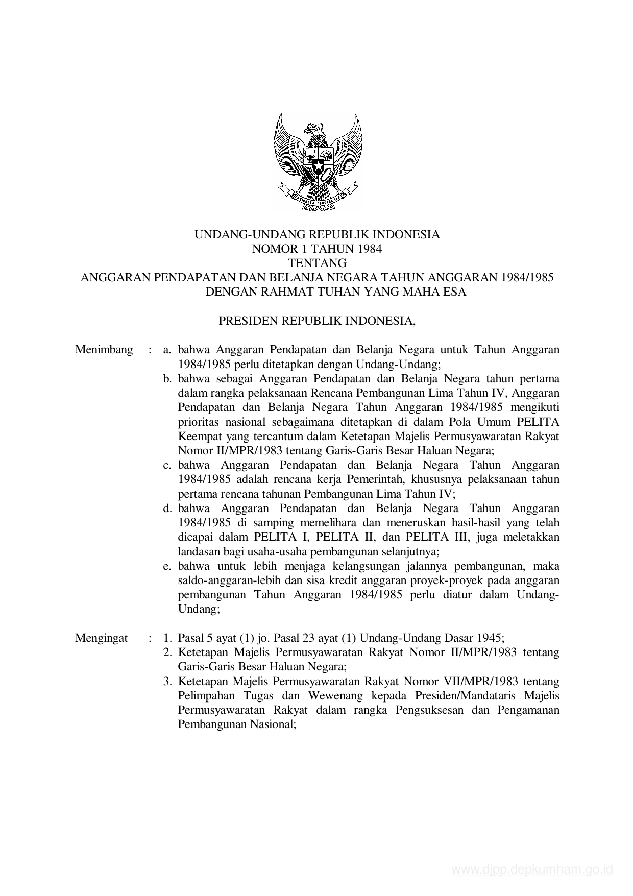 UU Nomor 1 Tahun 1984 | Undang-Undang Nomor 1 Tahun 1984 tentang ANGGARAN PENDAPATAN DAN BELANJA NEGARA TAHUN ANGGARAN 1984/1985