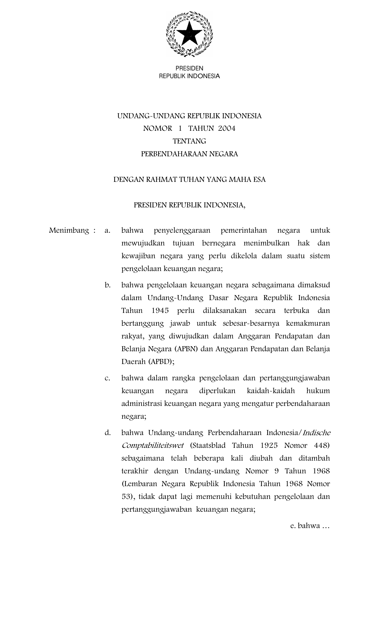 UU Nomor 1 Tahun 2004 | Undang-Undang Nomor 1 Tahun 2004 tentang PERBENDAHARAAN NEGARA