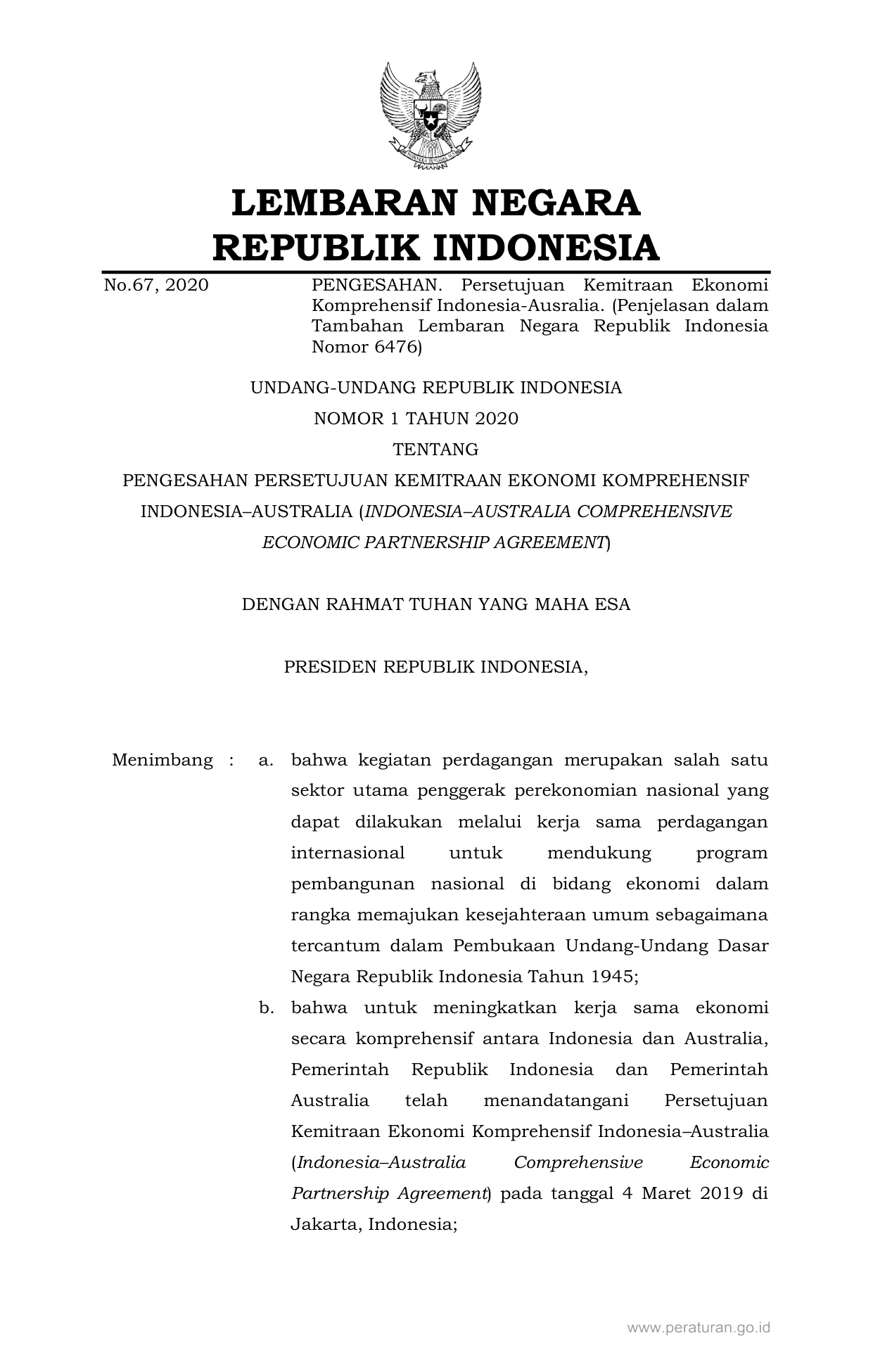 UU Nomor 1 Tahun 2020 | Undang-Undang Nomor 1 Tahun 2020 tentang PENGESAHAN PERSETUJUAN KEMITRAAN EKONOMI KOMPREHENSIF INDONESIA–AUSTRALIA (INDONESIA–AUSTRALIA COMPREHENSIVE ECONOMIC PARTNERSHIP AGREEMENT)