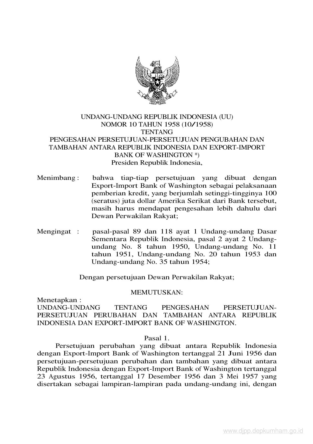 UU Nomor 10 Tahun 1958 | Undang-Undang Nomor 10 Tahun 1958 tentang PENGESAHAN PERSETUJUAN-PERSETUJUAN PENGUBAHAN DAN TAMBAHAN ANTARA REPUBLIK INDONESIA DAN EXPORT-IMPORT BANK OF WASHINGTON