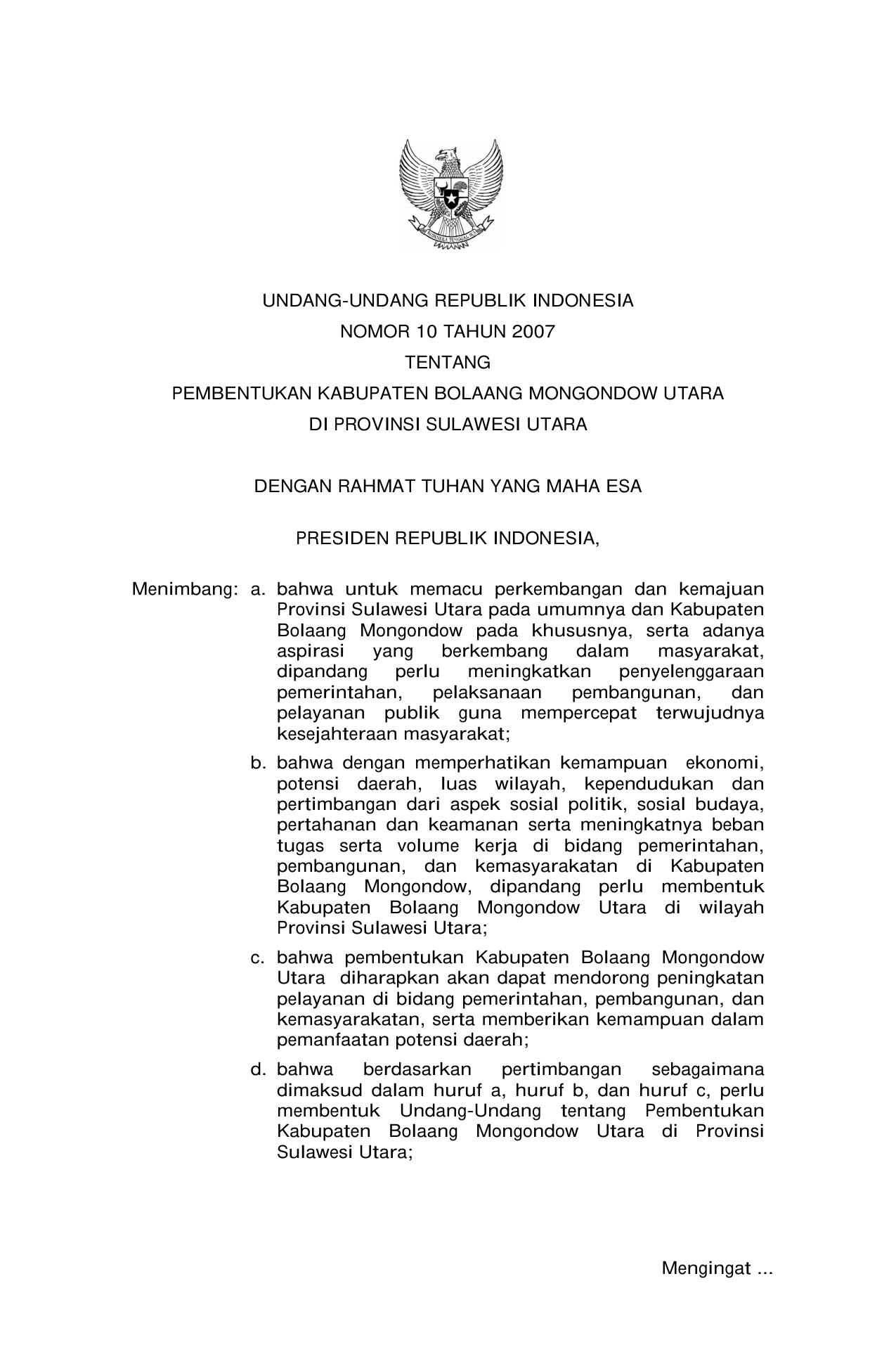 UU Nomor 10 Tahun 2007 | Undang-Undang Nomor 10 Tahun 2007 tentang PEMBENTUKAN KABUPATEN BOLAANG MONGONDOW UTARA DI PROVINSI SULAWESI UTARA