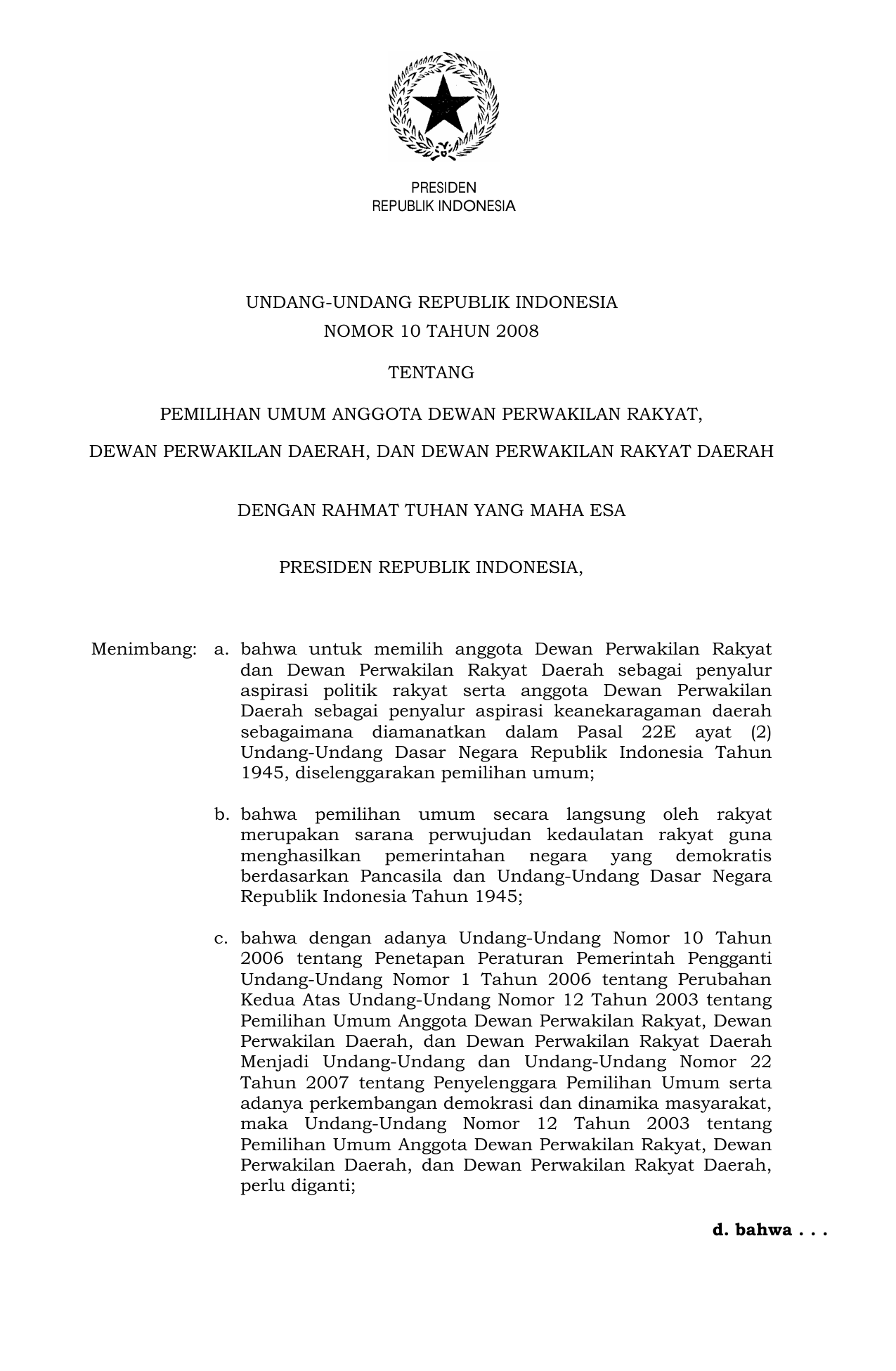 UU Nomor 10 Tahun 2008 | Undang-Undang Nomor 10 Tahun 2008 tentang PEMILIHAN UMUM ANGGOTA DEWAN PERWAKILAN RAKYAT, DEWAN PERWAKILAN DAERAH, DAN DEWAN PERWAKILAN RAKYAT DAERAH