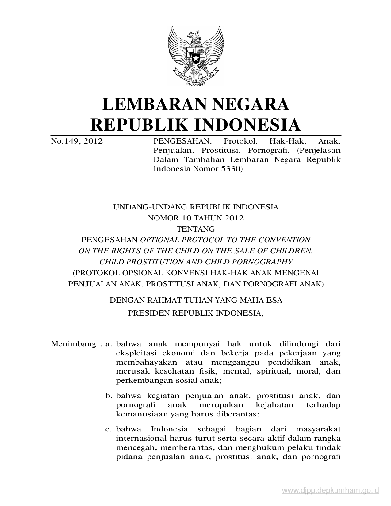 UU Nomor 10 Tahun 2012 | Undang-Undang Nomor 10 Tahun 2012 tentang PENGESAHAN OPTIONAL PROTOCOL TO THE CONVENTION ON THE RIGHTS OF THE CHILD ON THE SALE OF CHILDREN, CHILD PROSTITUTION AND CHILD PORNOGRAPHY (PROTOKOL OPSIONAL KONVENSI HAK-HAK ANAK MENGENAI PENJUALAN ANAK, PROSTITUSI ANAK, DAN PORNOGRAFI ANAK)