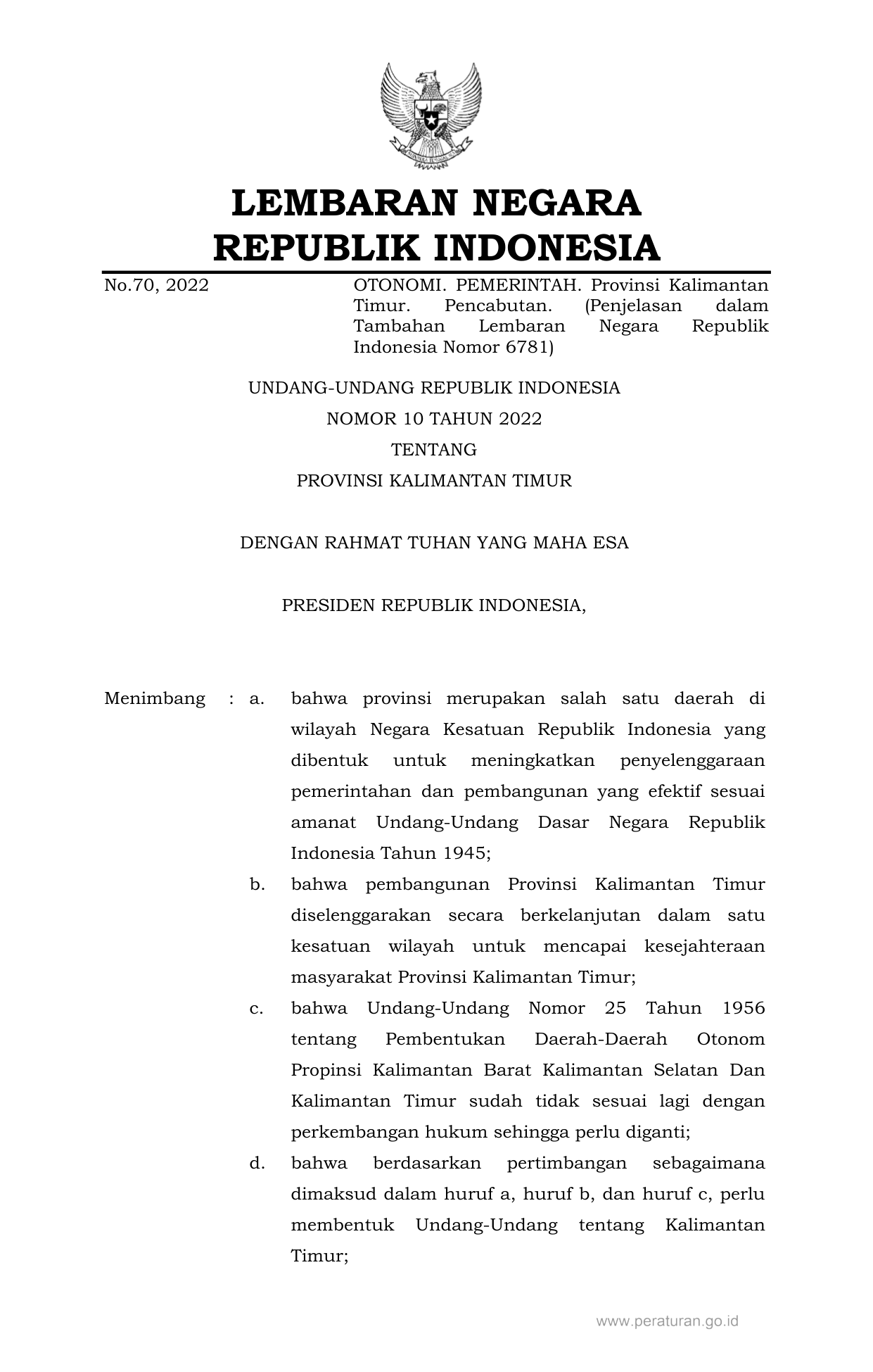 UU Nomor 10 Tahun 2022 | Undang-Undang Nomor 10 Tahun 2022 tentang PROVINSI KALIMANTAN TIMUR
