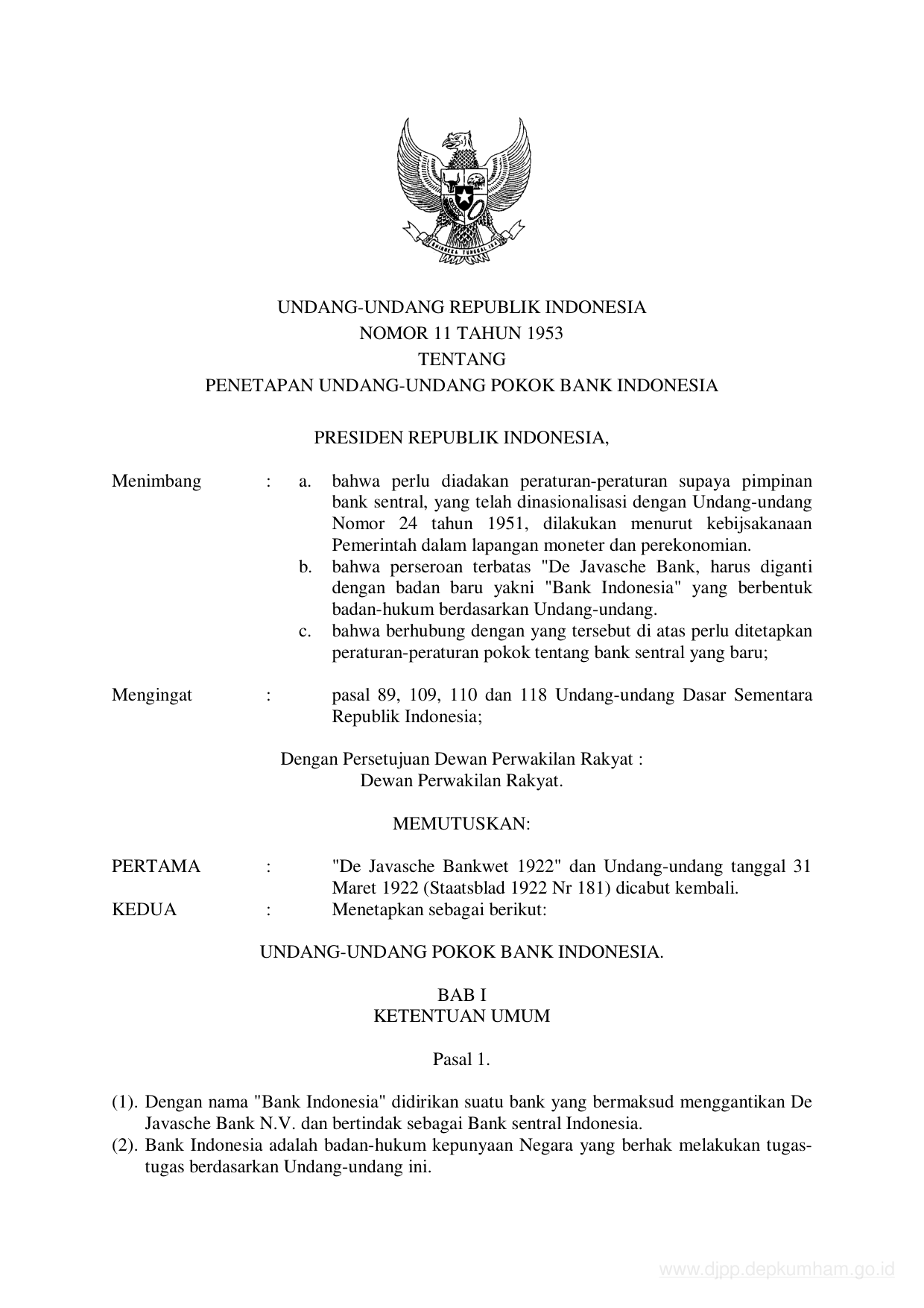 UU Nomor 11 Tahun 1953 | Undang-Undang Nomor 11 Tahun 1953 tentang PENETAPAN UNDANG-UNDANG POKOK BANK INDONESIA PENETAPAN PERATURAN DALAM UNDANG-UNDANG DARURAT NOMOR 4 TAHUN 1950 TENTANG PENERIMAAN ANGGOTA ANGKATAN PERANG R.I.S. (LEMBARAN-NEGARA NOMOR 5 TAHUN 1950) SEBAGAI UNDANG-UNDANG