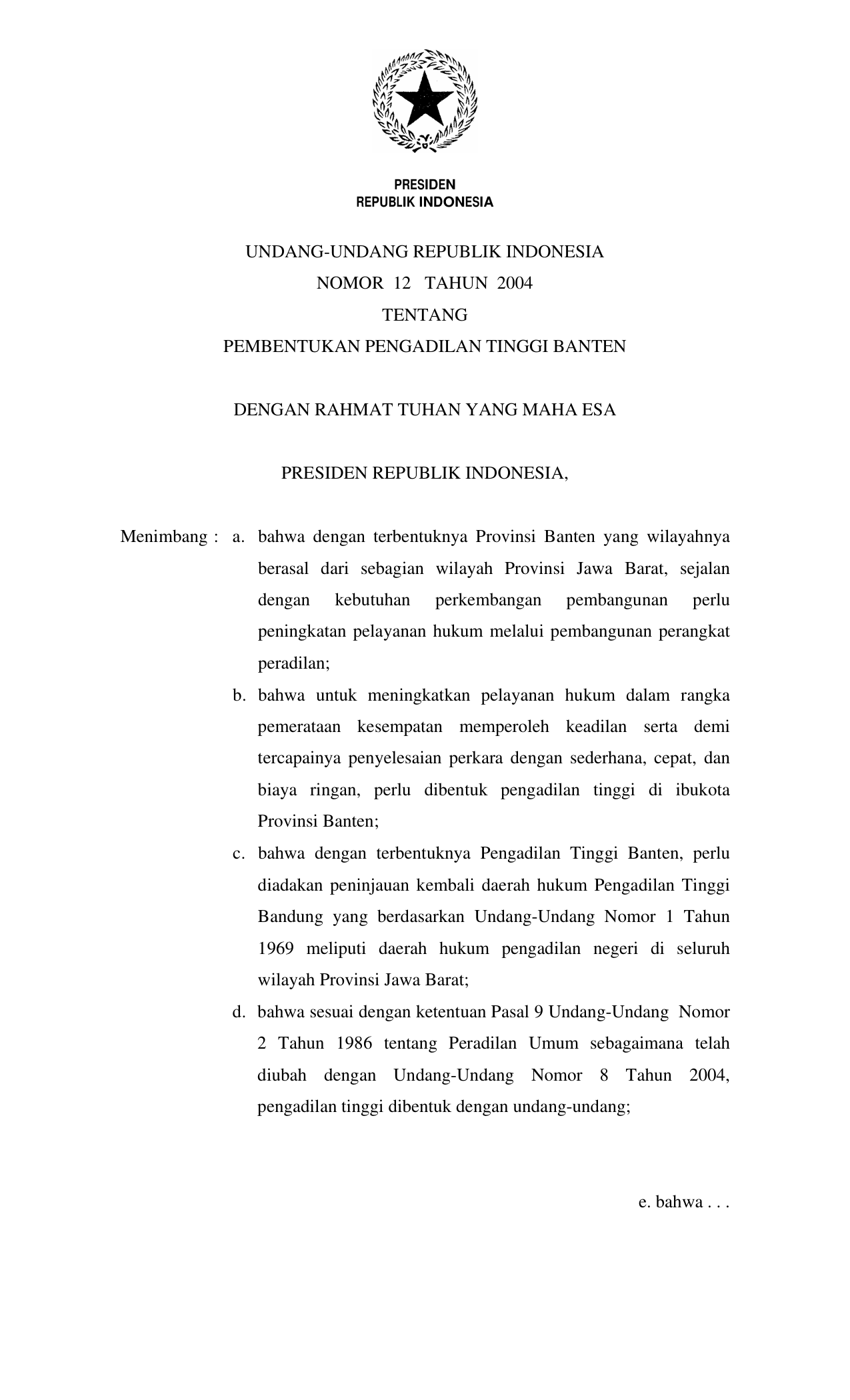 UU Nomor 12 Tahun 2004 | Undang-Undang Nomor 12 Tahun 2004 tentang PEMBENTUKAN PENGADILAN TINGGI BANTEN