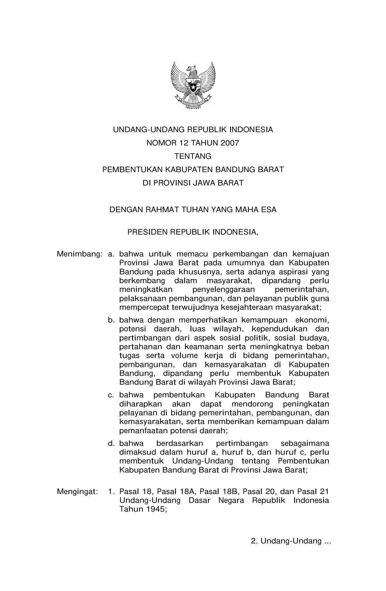 UU Nomor 12 Tahun 2007 | Undang-Undang Nomor 12 Tahun 2007 tentang PEMBENTUKAN KABUPATEN BANDUNG BARAT DI PROVINSI JAWA BARAT