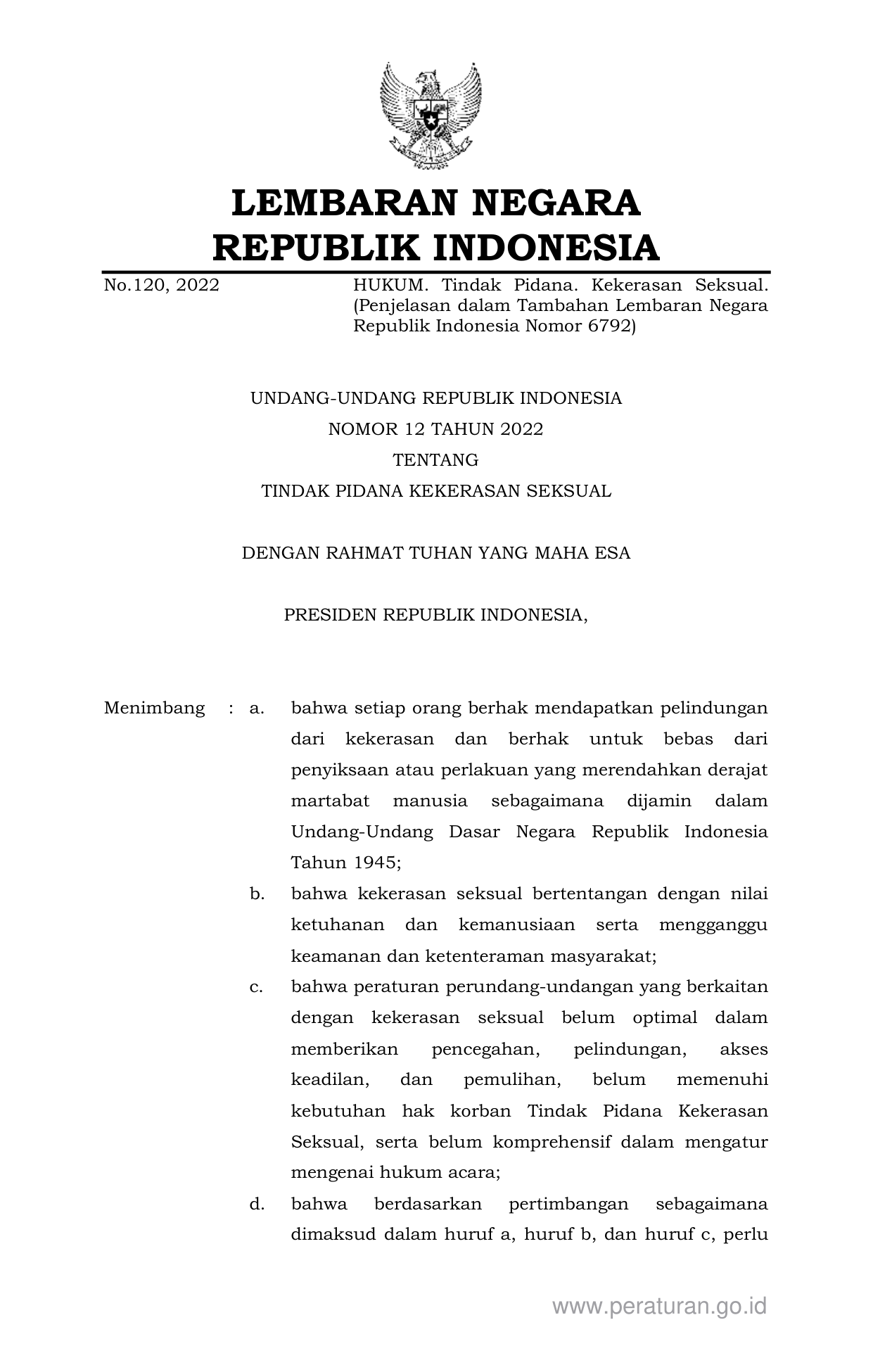 UU Nomor 12 Tahun 2022 | Undang-Undang Nomor 12 Tahun 2022 tentang TINDAK PIDANA KEKERASAN SEKSUAL