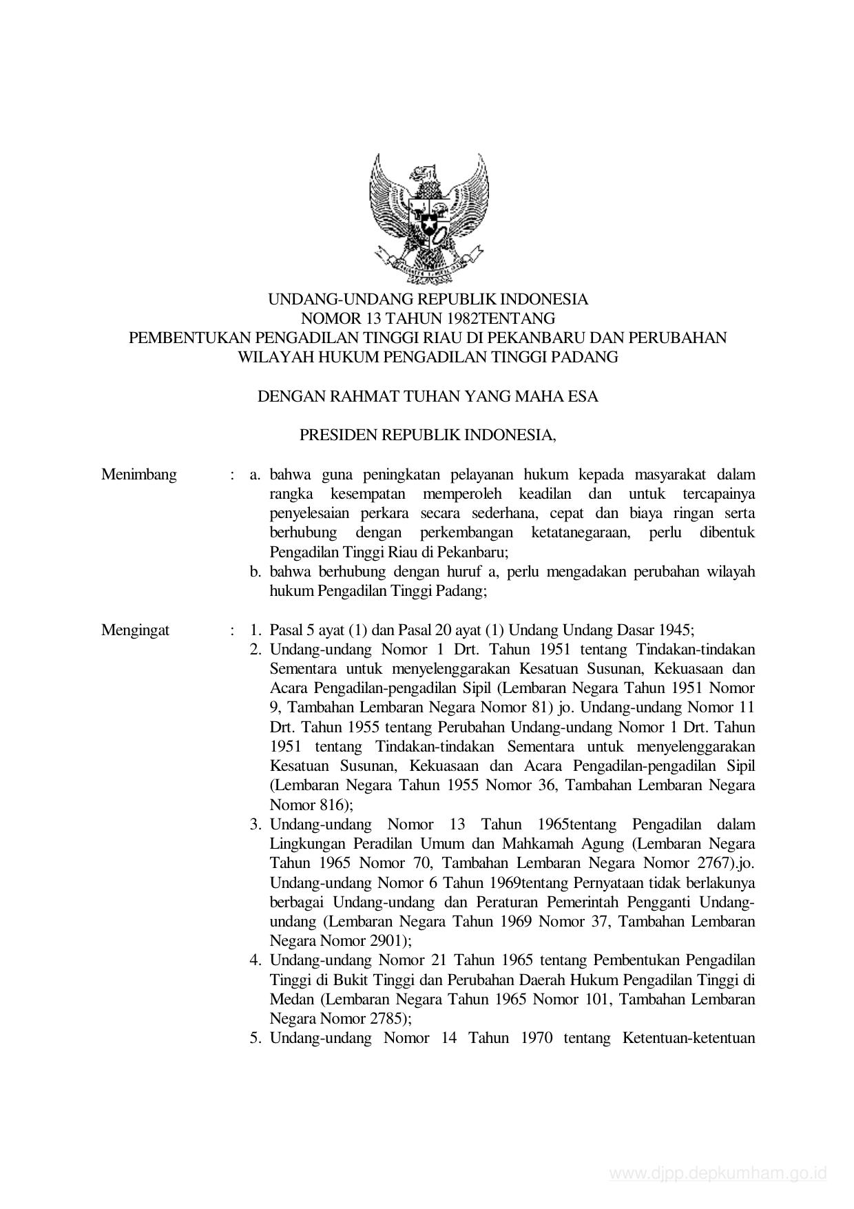 UU Nomor 13 Tahun 1982 | Undang-Undang Nomor 13 Tahun 1982 tentang PEMBENTUKAN PENGADILAN TINGGI RIAU DI PEKANBARU DAN PERUBAHAN WILAYAH HUKUM PENGADILAN TINGGI PADANG
