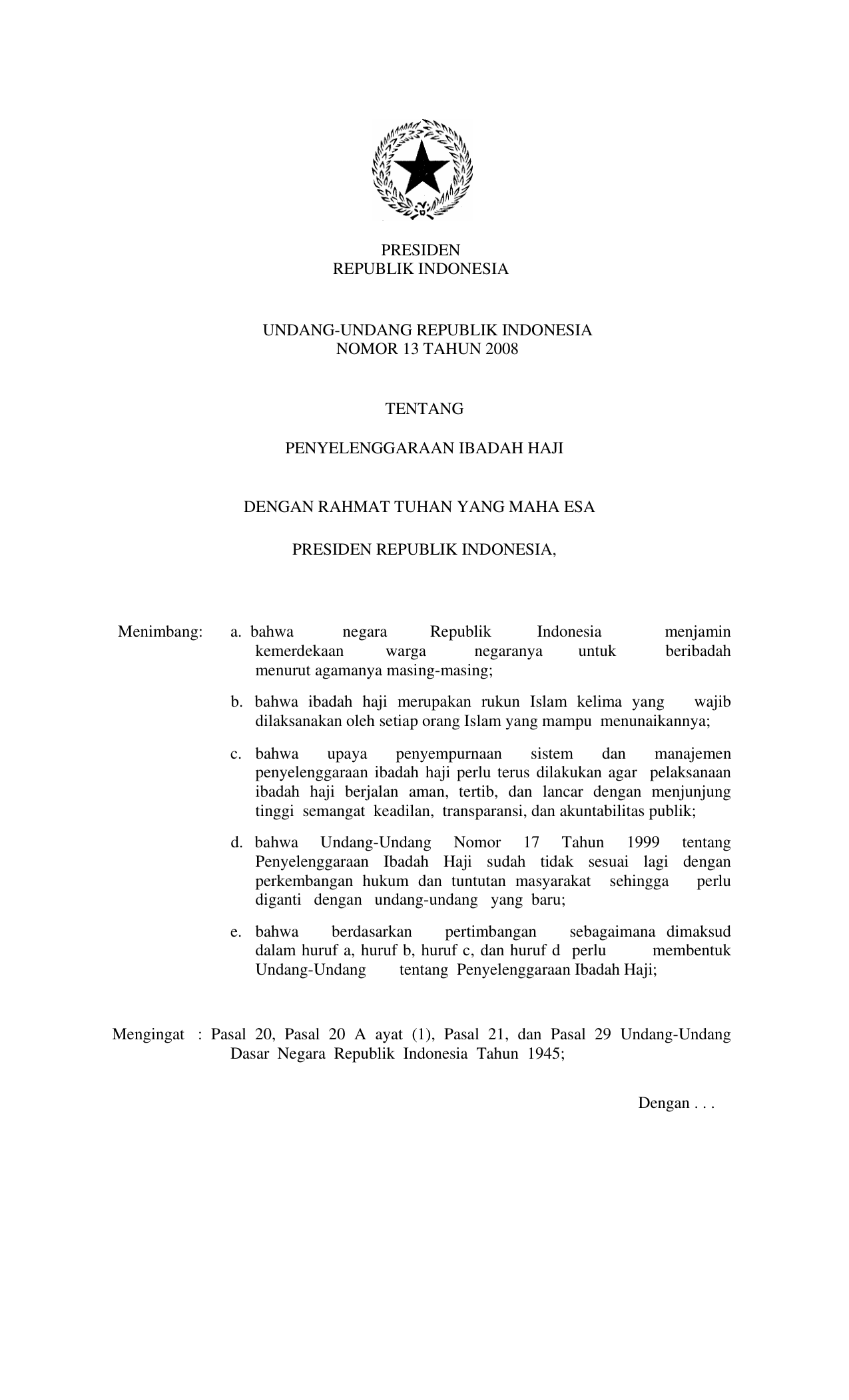 UU Nomor 13 Tahun 2008 | Undang-Undang Nomor 13 Tahun 2008 tentang PENYELENGGARAAN IBADAH HAJI