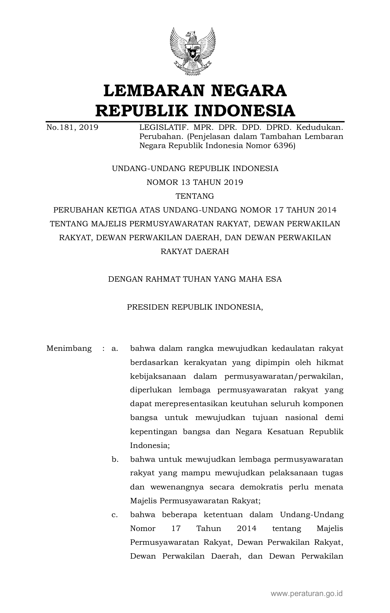 UU Nomor 13 Tahun 2019 | Undang-Undang Nomor 13 Tahun 2019 tentang PERUBAHAN KETIGA ATAS UNDANG-UNDANG NOMOR 17 TAHUN 2014 TENTANG MAJELIS PERMUSYAWARATAN RAKYAT, DEWAN PERWAKILAN RAKYAT, DEWAN PERWAKILAN DAERAH, DAN DEWAN PERWAKILAN RAKYAT DAERAH