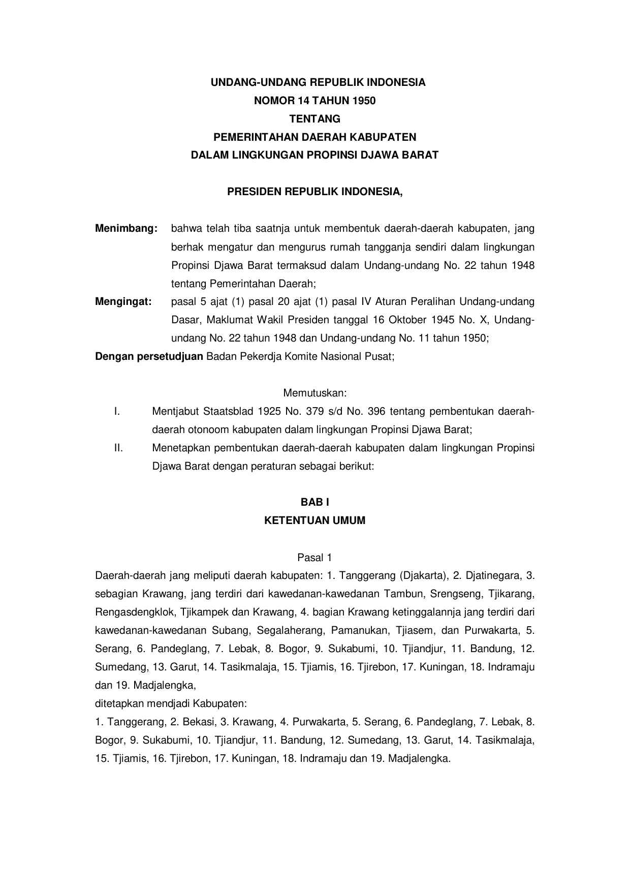 UU Nomor 14 Tahun 1950 | Undang-Undang Nomor 14 Tahun 1950 tentang PEMERINTAHAN DAERAH KABUPATEN DALAM LINGKUNGAN PROPINSI DJAWA BARAT