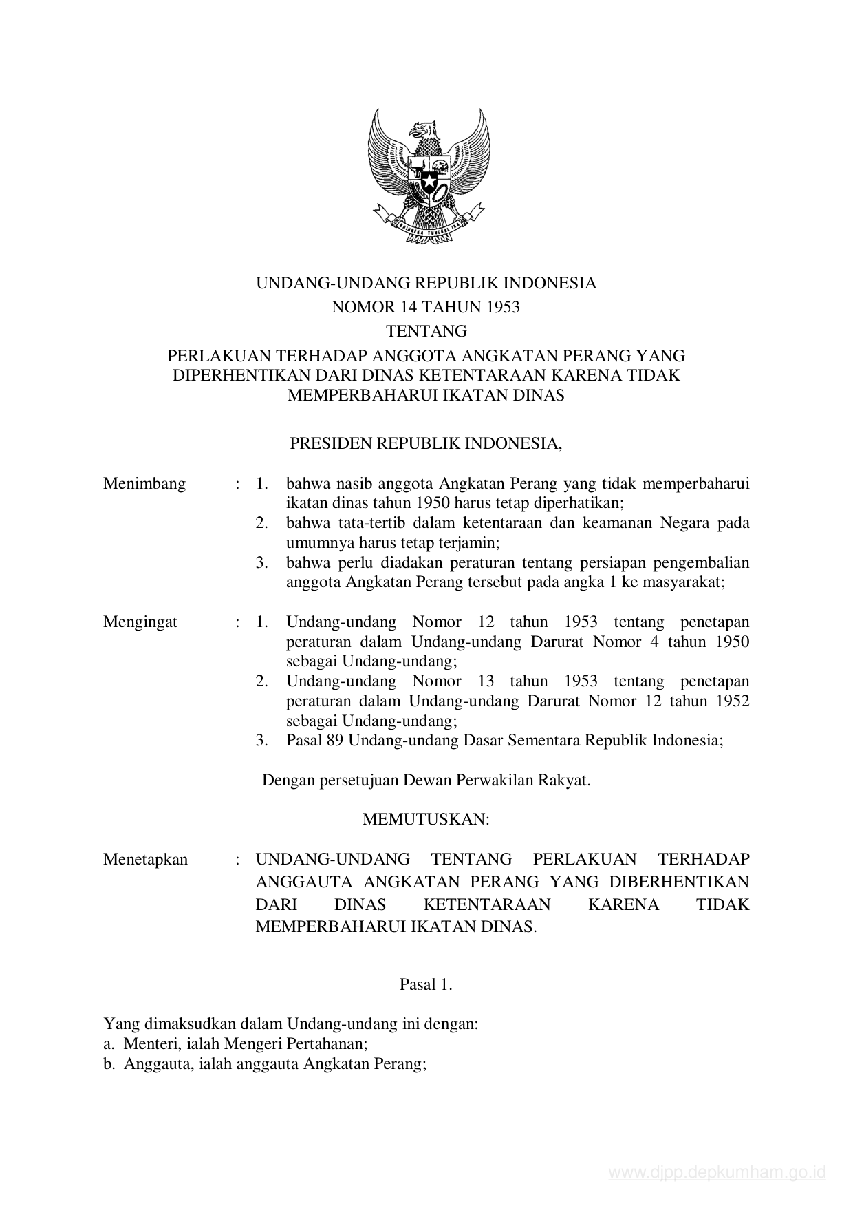 UU Nomor 14 Tahun 1953 | Undang-Undang Nomor 14 Tahun 1953 tentang PERLAKUAN TERHADAP ANGGOTA ANGKATAN PERANG YANG DIPERHENTIKAN DARI DINAS KETENTARAAN KARENA TIDAK MEMPERBAHARUI IKATAN DINAS