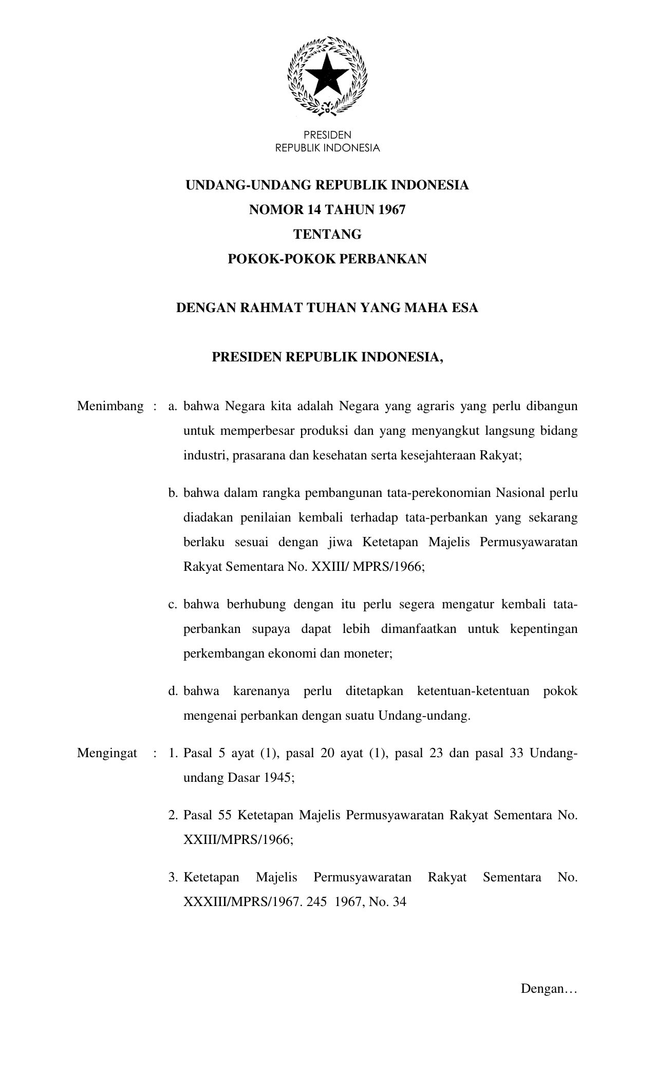 UU Nomor 14 Tahun 1967 | Undang-Undang Nomor 14 Tahun 1967 tentang POKOK-POKOK PERBANKAN